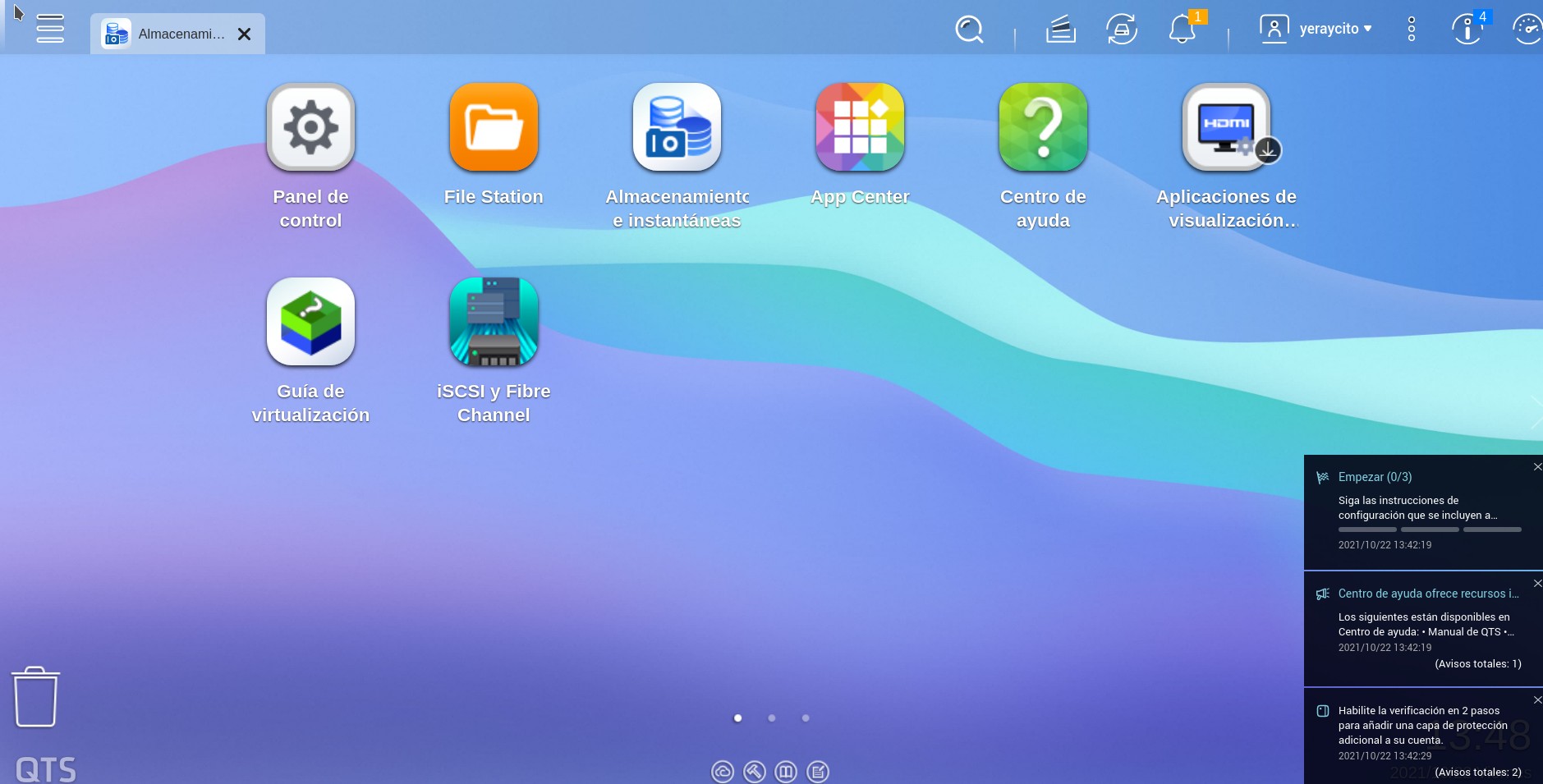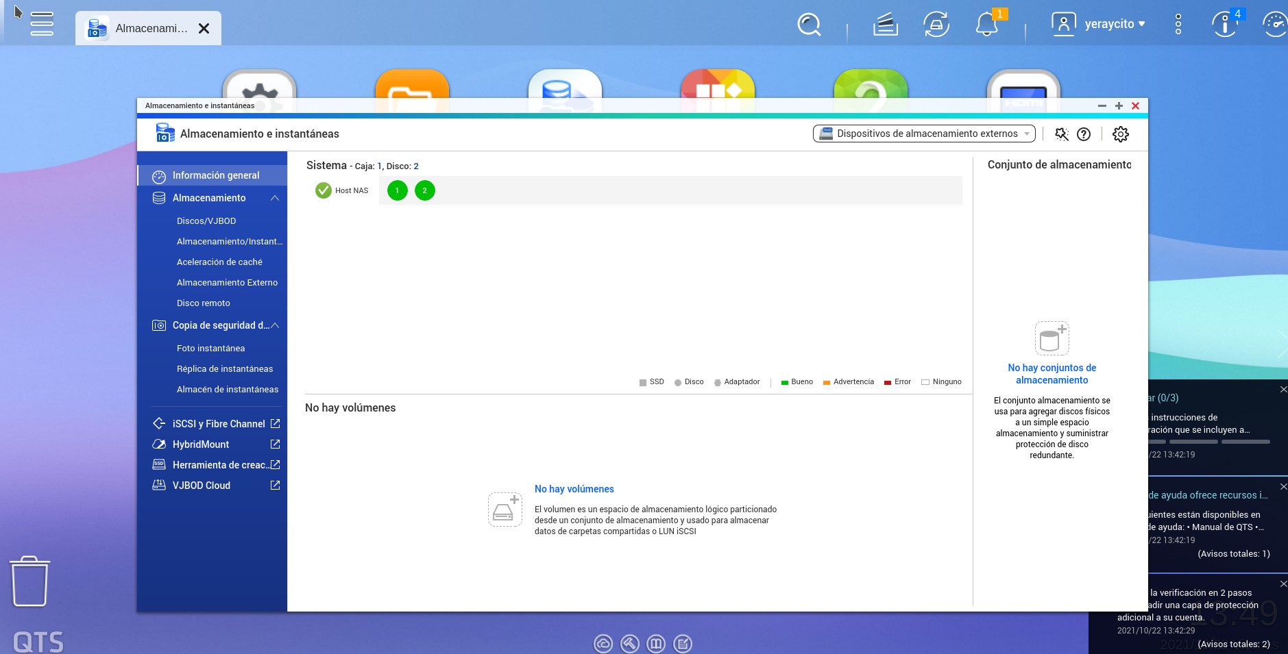 Nos obligan a aceptar los términos y condiciones. Accedemos por fin a la interfaz principal del nas. Nos salen varias ventanas. Una de ellas sobre el envío de datos a Qnap que podemos rechazar. También aparece otra ventana recordando que no hay ningún volumen en el nas. Desde que se inició la instalación hasta llegar a la pantalla principal ha llevado más o menos media hora.