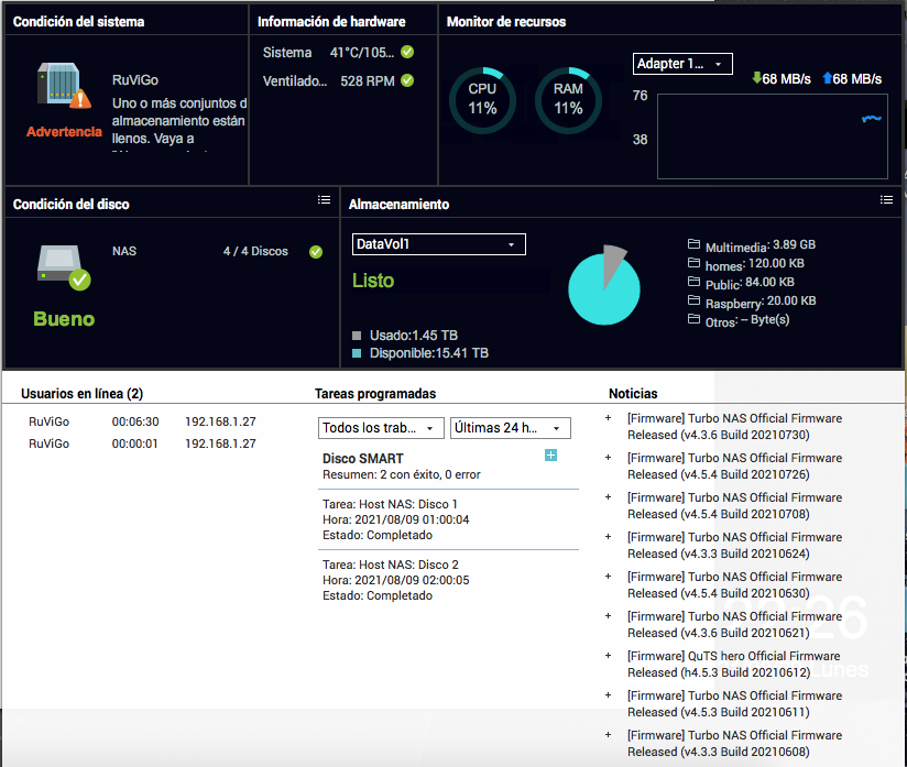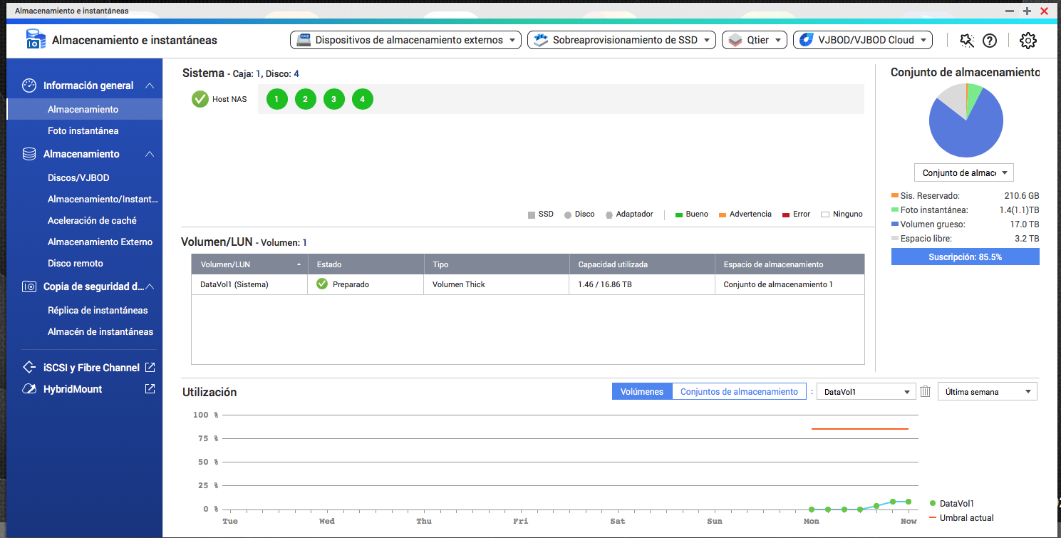 Lo del umbral no es más que un aviso que podemos configurar como queramos que es símplemente eso, un aviso de que nos queda poco espacio en el nas para almacenar datos. Eso no quiere decir que no tengamos espacio en el nas ni que vaya a funcionar mal o incluso se corrompan los datos que tengamos almacenados. Si lo configuramos al 80% el umbral nos avisa de que hemos llegado a ese punto pero aún nos queda un 20% para almacenar así que no pasa nada. Lo que si es conveniente es dejar algo de espacio sin asignar en el conjunto de almacenamiento para que el nas " tenga espacio " y no disminuya el rendimiento. Es algo parecido a lo de reservar espacio para las instantáneas. Al tenerlo configurado de esa manera " sin asignar " ese espacio no lo podremos utilizar para almacenar archivos pero si lo puede utilizar QTS en el caso de que no tenga espacio en el volumen pero no para almacenar más datos nuestros sino para su propio funcionamiento. Un ejemplo de esto sería lo que te he indicado antes con tus instantaneas en tu nas. Al ser más grande el tamaño de tus instantaneas que el espacio reservado para ellas cómo sistema de emergencia para poder hacerlas QTS echa mano del espacio sin asignar. Aparte de esto no dejar espacio libre sin utilizar y llenarlo todo repercute en el rendimiento del sistema. Esto es válido no sólamente en nuestros nas sino también en cualquier ordenador y con cualquier sistema operativo que tenga discos duros o ssd. En el caso de los ssd siempre se ha dicho que no es conveniente que pasen del 80% de su ocupación porque disminuye ostensíblemente su rendimiento. En cualquier caso " si el nas se llena " tampoco pasa nada. Si quisiéramos meter más archivos en el nas no lo podríamos hacer por falta de espacio cómo ocurriría en cualquier disco duro de un ordenador normal pero los archivos que ya tuviéramos almacenados en el nas seguirían estando ahí.