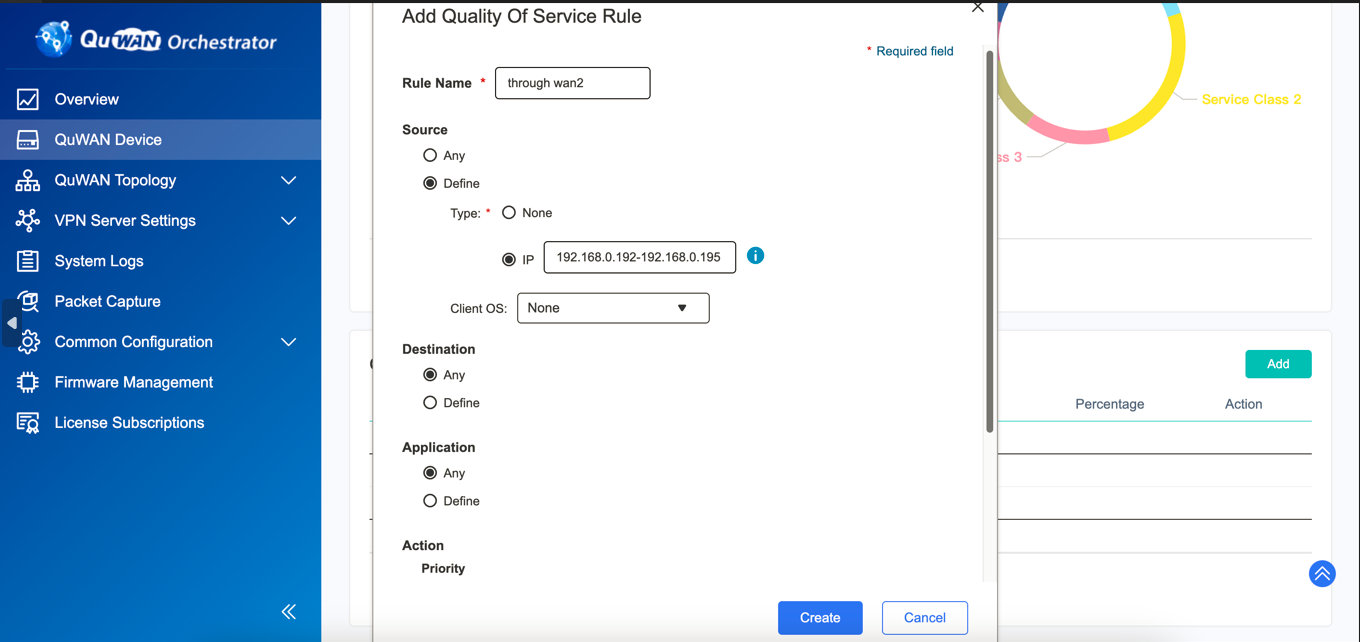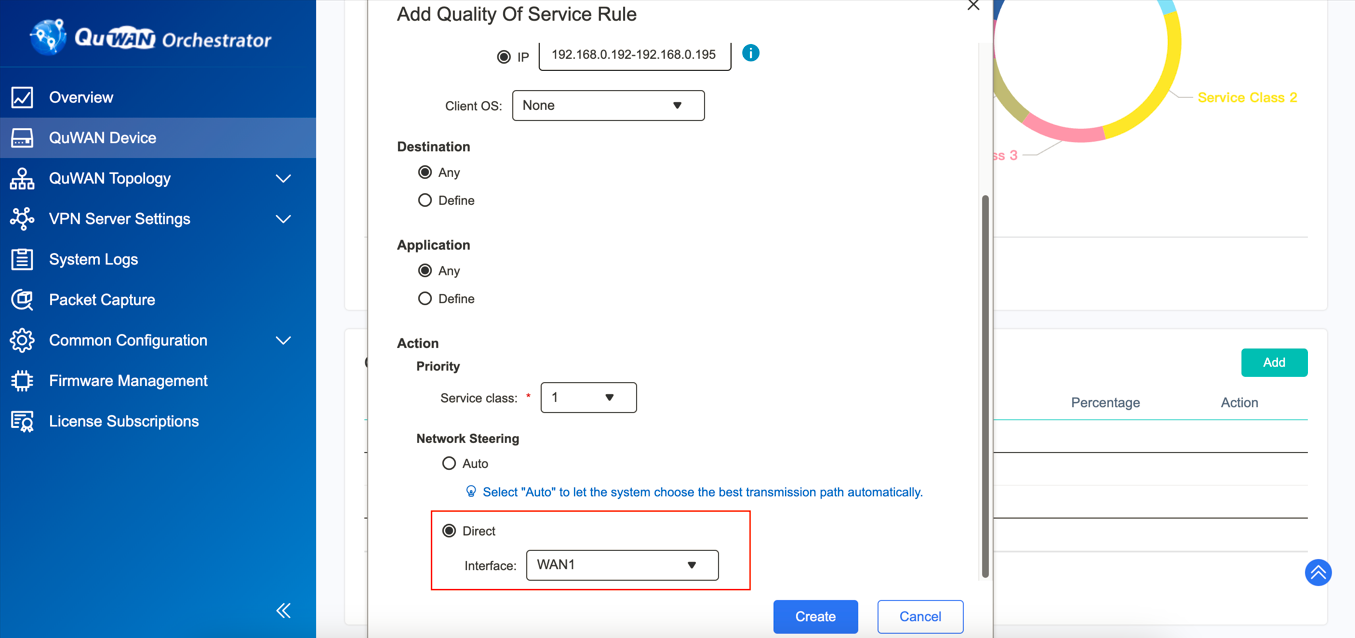 Desde ahí te das de alta en el QuWAN Orchestrator, y una vez que lo tienes todo vas a la opción "Dispositivo QuWAN" y en la pestaña "Calidad de Servicio" (nunca lo hubiera buscado en una pestaña con este título) puedes montar la regla que quieras (os dejo pantallazos).[