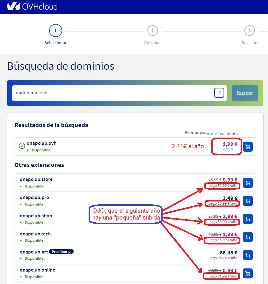 Por ejemplo he mirado si está disponible "qnapclub.ovh" y me muestran mas opciones en función de la terminación del nombre.