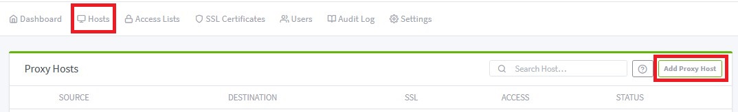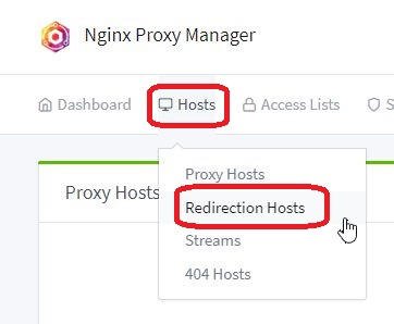 Luego en el Nginx vamos a host, "Redirections Host"