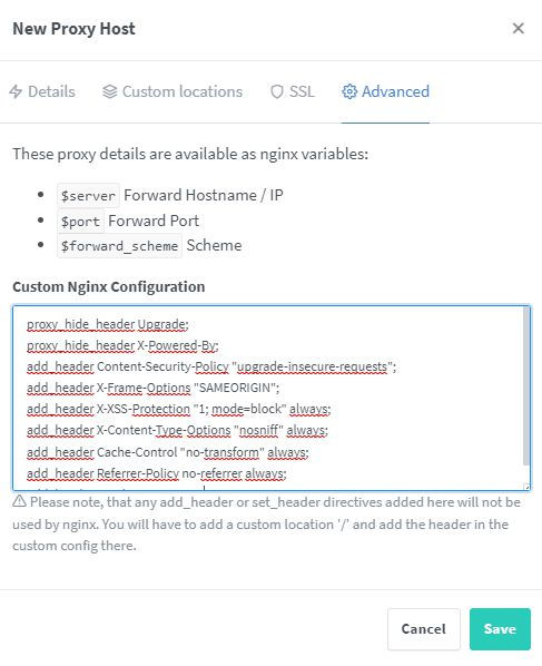 He visto que algunas web y dockers , son un poco especiales y mejoran su acceso si en la última sección de advanced, agregamos estos parámetros.