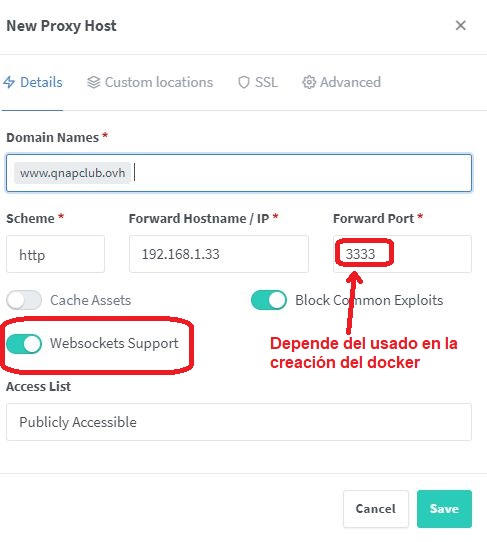 El docker lo hemos creado siguiendo este otro hilo anterior. Es decir usa el puerto 9080 de la ip privada de la nas.