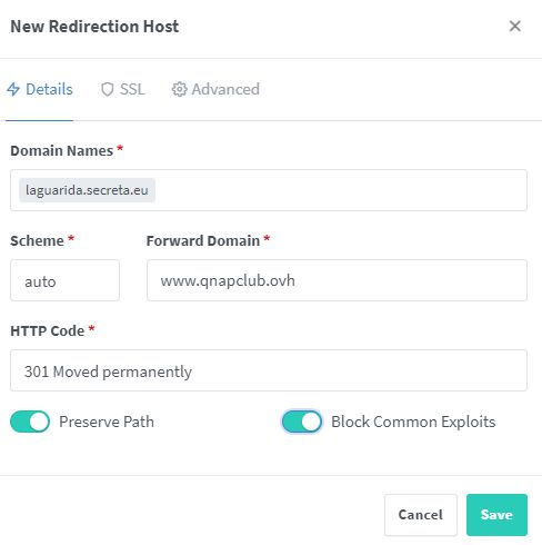Y queremos que cuando alguien vaya a web de "laguarida.secreta.eu", sea llevado a "www.qnapclub.ovh"