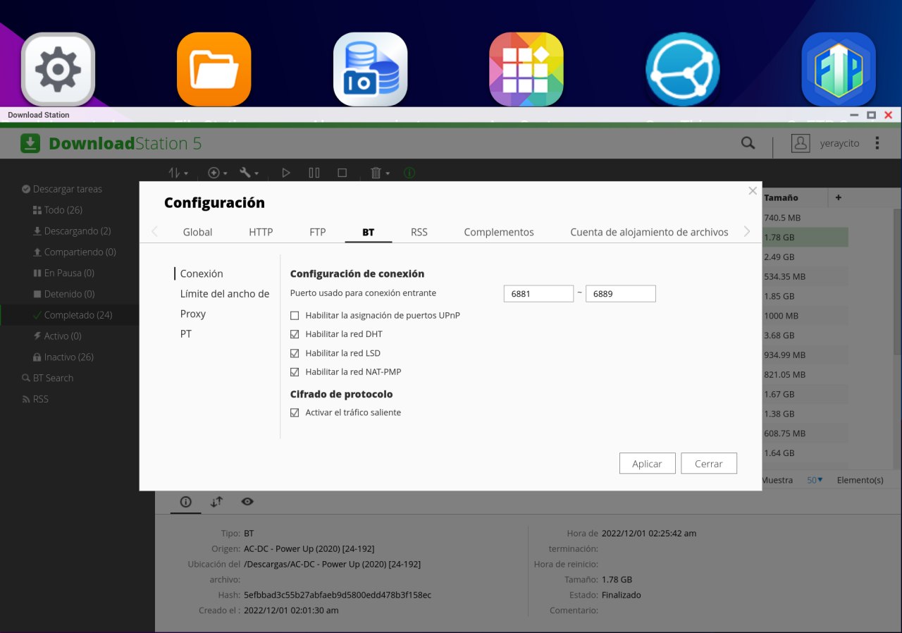Una vez instalado Download Station en el nas lo abrimos y lo primero que hay que hacer es entrar en su configuración. En el apartado Conexión podemos ver y modificar si queremos los puertos que va a usar el programa para su funcionamiento. En este punto tengo que decir que para que el programa funcione NO ES NECESARIO abrir ningún puerto en nuestro router, ni lógicamente en el nas. En este apartado Conexión en el que estamos tenemos que DESABILITAR la opción que nos aparece Habilitar la asignación de puertos UPnP.