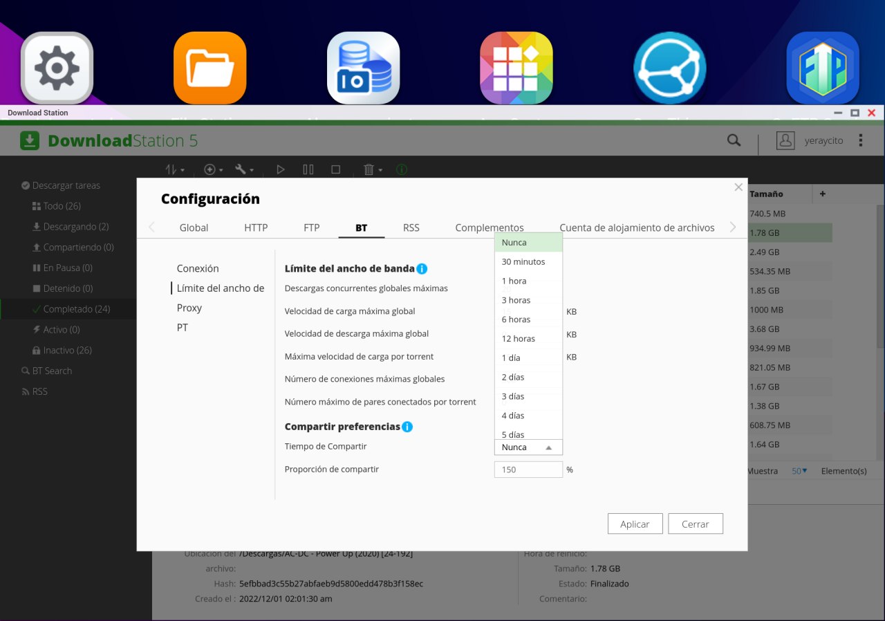Uno de los "problemas" con Download Station que he leido algunas veces que les ocurre a algunos es cuando queremos seguir compartiendo un tiempo un archivo que hayamos descargado en el nas. En el mismo apartado que estamos de la configuración podemos configurar ese aspecto cómo queramos en las opciones que nos aparecen en Compartir preferencias: