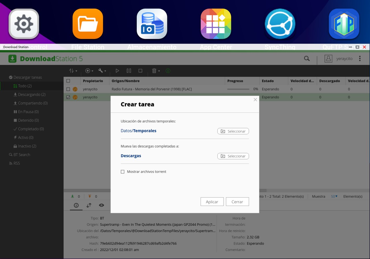 Hecho esto el archivo torrent que hayamos puesto se empezará a descargar. Si añadimos un segundo archivo torrent para descargar nos volverán a aparecer ya escogidas las dos carpetas citadas antes. Por supuesto si ese segundo archivo torrent queremos que se guarde en una ubicación distinta en el nas se lo podemos indicar.