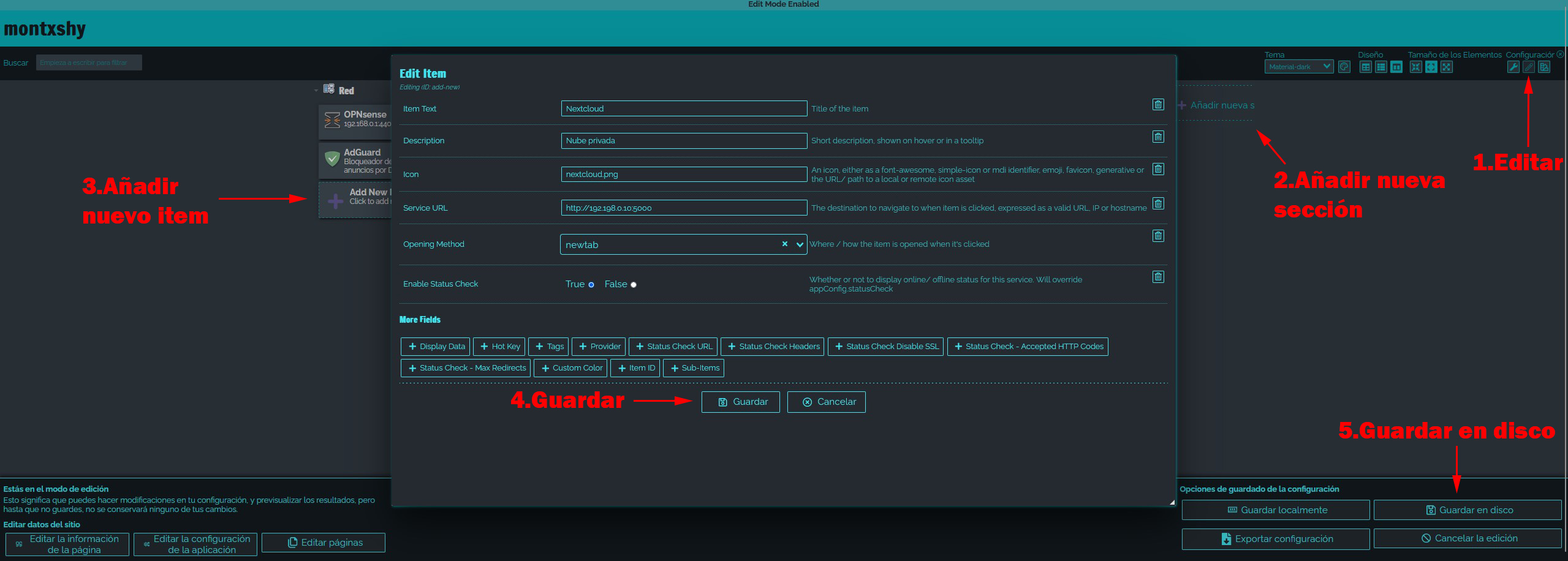 SI queréis personalizarlo con iconos locales debeis meterlos en la carpeta /share/DockerData/Dashy/item-icons y cuando editamos un enlace y nos prgunta por el icono pondremos el nombre del icono con su extensión png (pihole.png) otra manera muy sencilla de usar iconos es esta web: https://github.com/WalkxHub/dashboard-icons que va a cubrir la mayoría de vuestras necesidades, copiais el enlace del icono y lo pegás.
