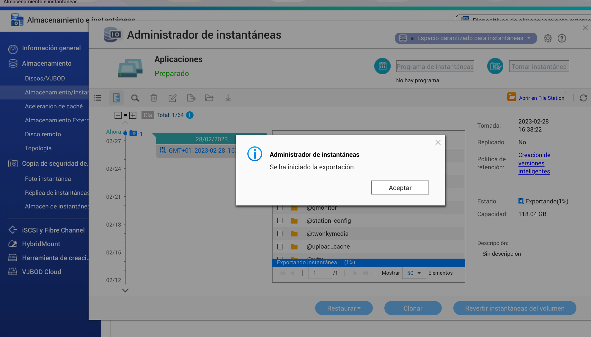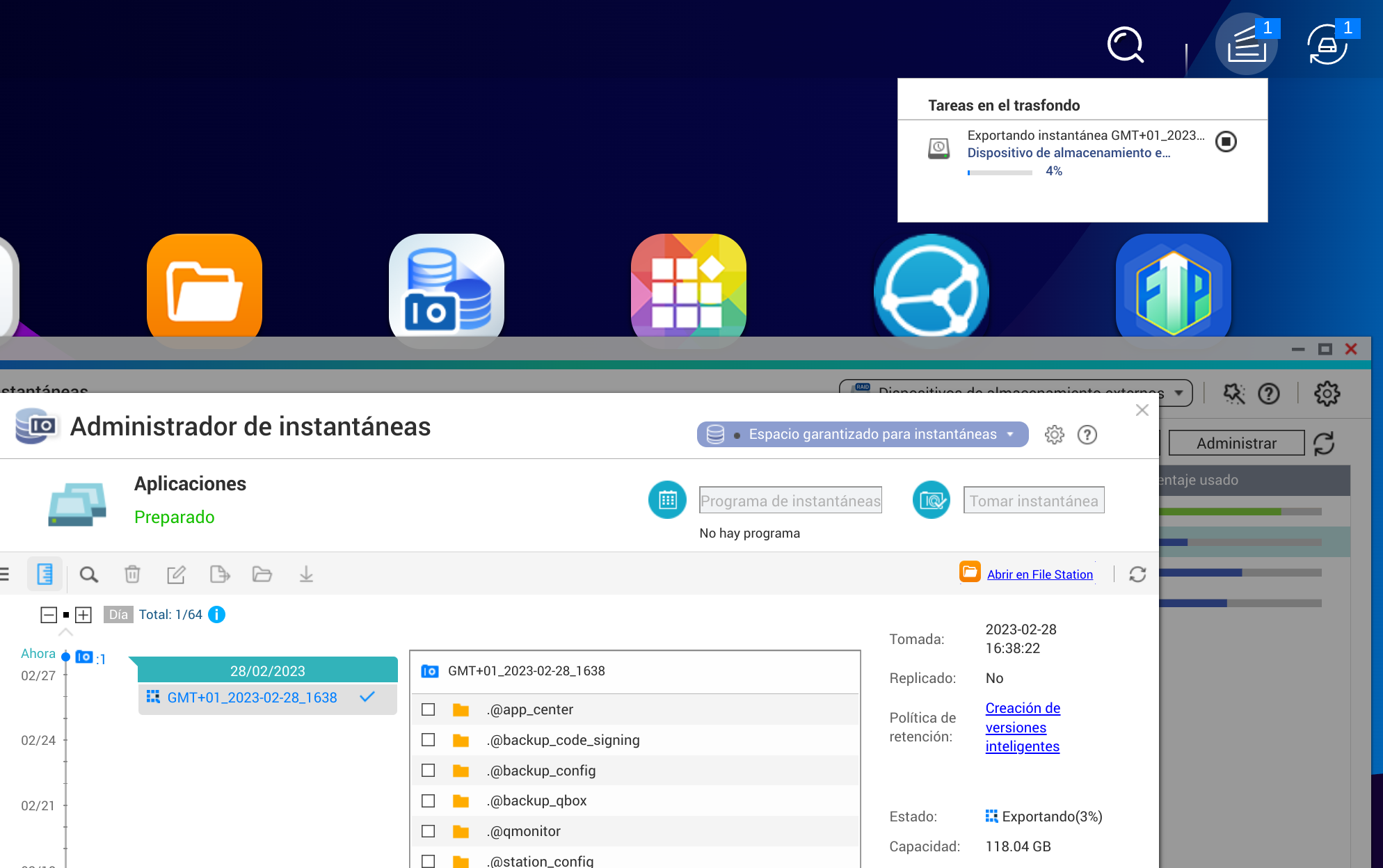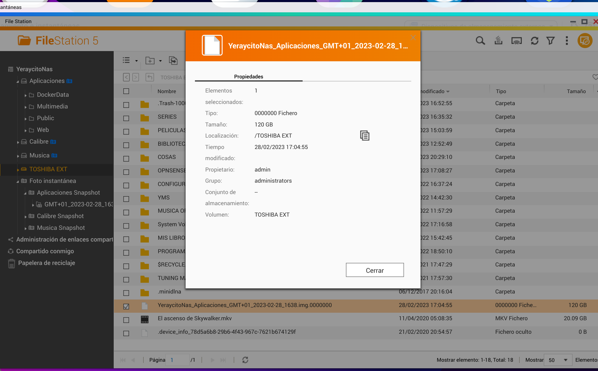 Una vez que se ha terminado de exportar la instantánea al disco duro externo conectado al nas la podemos ver desde File Station y en mi caso también se puede ver que tiene un tamaño de 120 Gigas