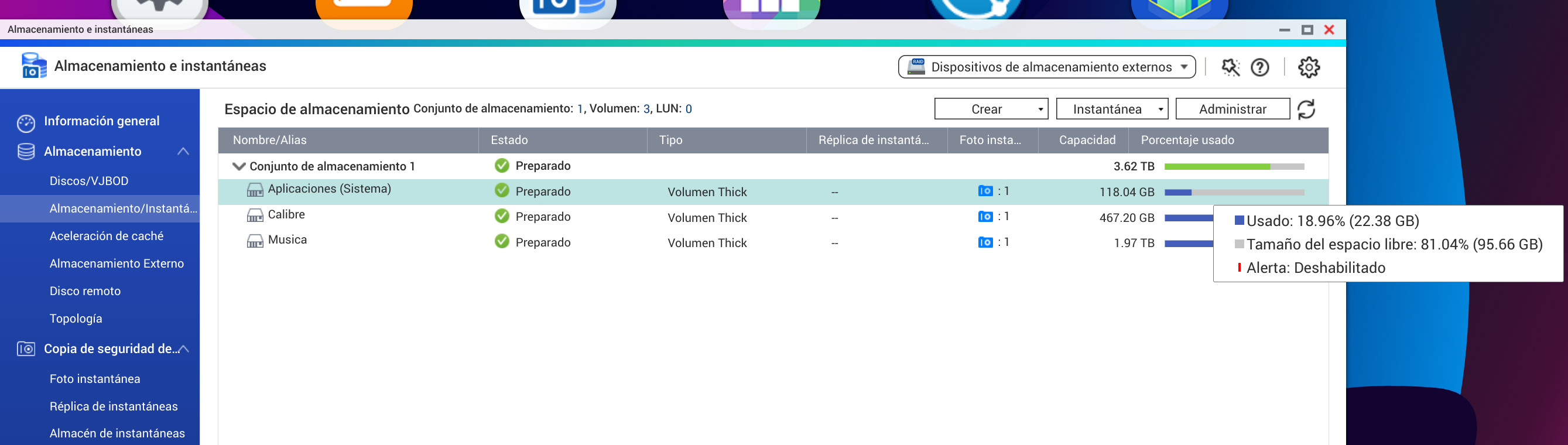 Esto hay que tenerlo en cuenta por varios motivos. El sistema que emplea Qnap a la hora de las instantáneas es algo opaco sobretodo con el espacio que ocupan. En este caso al ser la primera y única instantánea en ese Volumen de mi nas ocupa la totalidad del Volumen. Las siguientes instantáneas que se hicieran en ese volumen es muy posible que tengan un tamaño distinto que podrá ser menor o mayor según los casos.