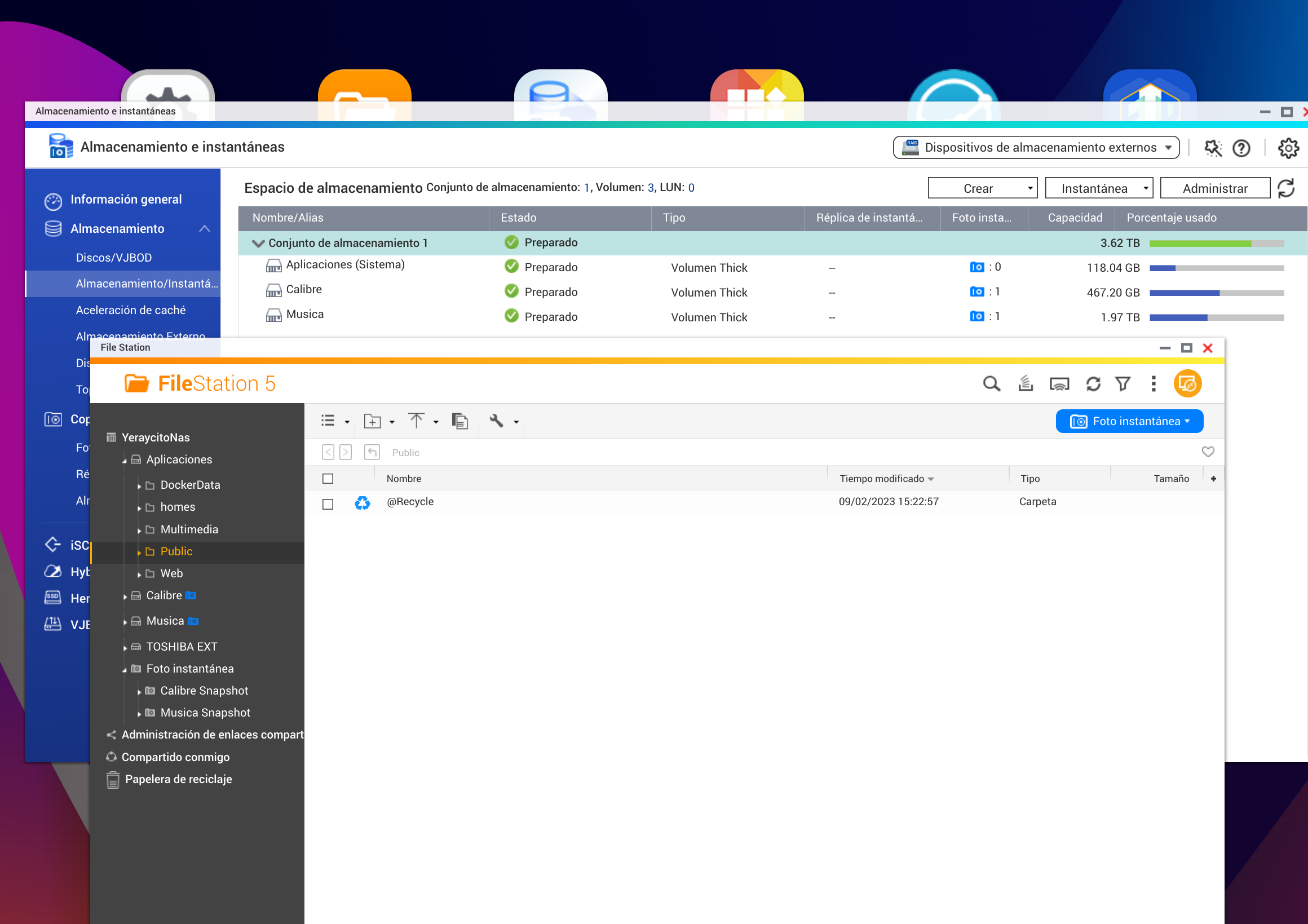 Y ahora me toca explicar algo que me ha resultado treméndamente interesante. Si os fijáis en la imagen que acabo de poner se puede ver que al acabar el proceso de importación de la instantánea en el Volumen de Sistema de mi nas NO HAY NINGUNA INSTANTANEA y si nos vamos a File Station lo podemos comprobar también, en mi nas sólo hay las instantáneas de mis otros dos Volúmenes pero NO el de Sistema