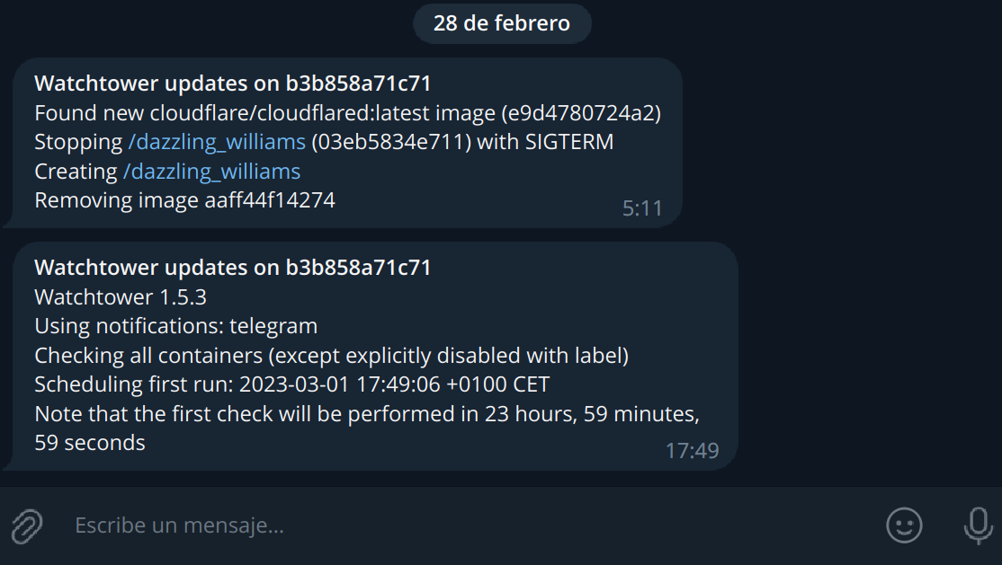Para comprobar que efectívamente la importación de la instantánea externa conlleva también su aplicación....un ejemplo. En mi nas tengo instalado el contenedor Wacthtower configurado con notificaciones por Telegram y cuando el contenedor se reinicia o lo hace el nas me manda por Telegram una notificación en el que me indica que está activo. Pues bien, a la hora que he terminado la importación de la instantánea me ha notificado que estaba activo.