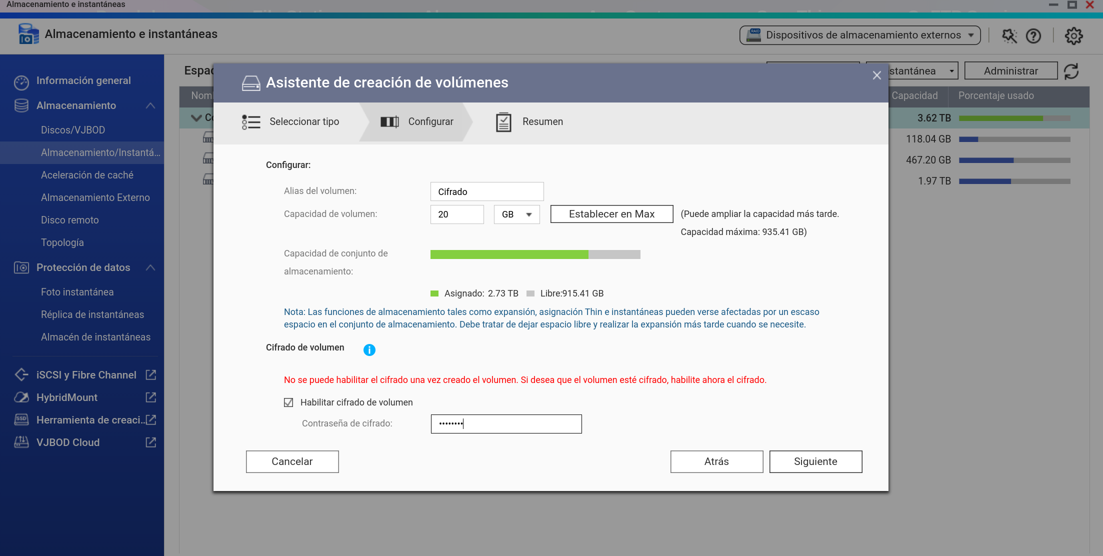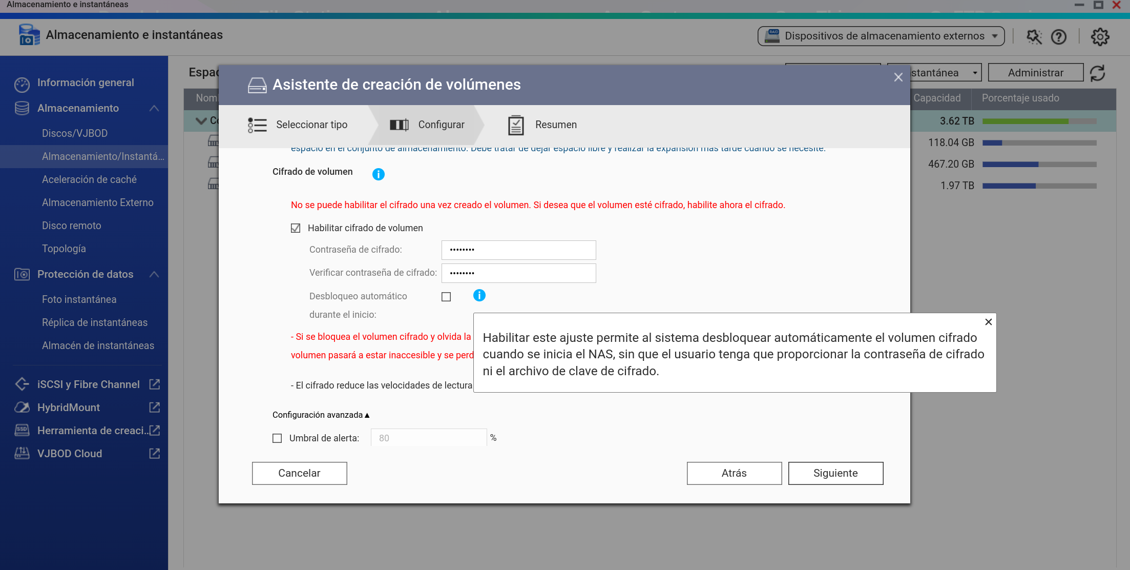En lugar de escoger la opción de que ese Volumen cifrado se monte y descifre cada vez que se inicia el nas NO LO HAGO.