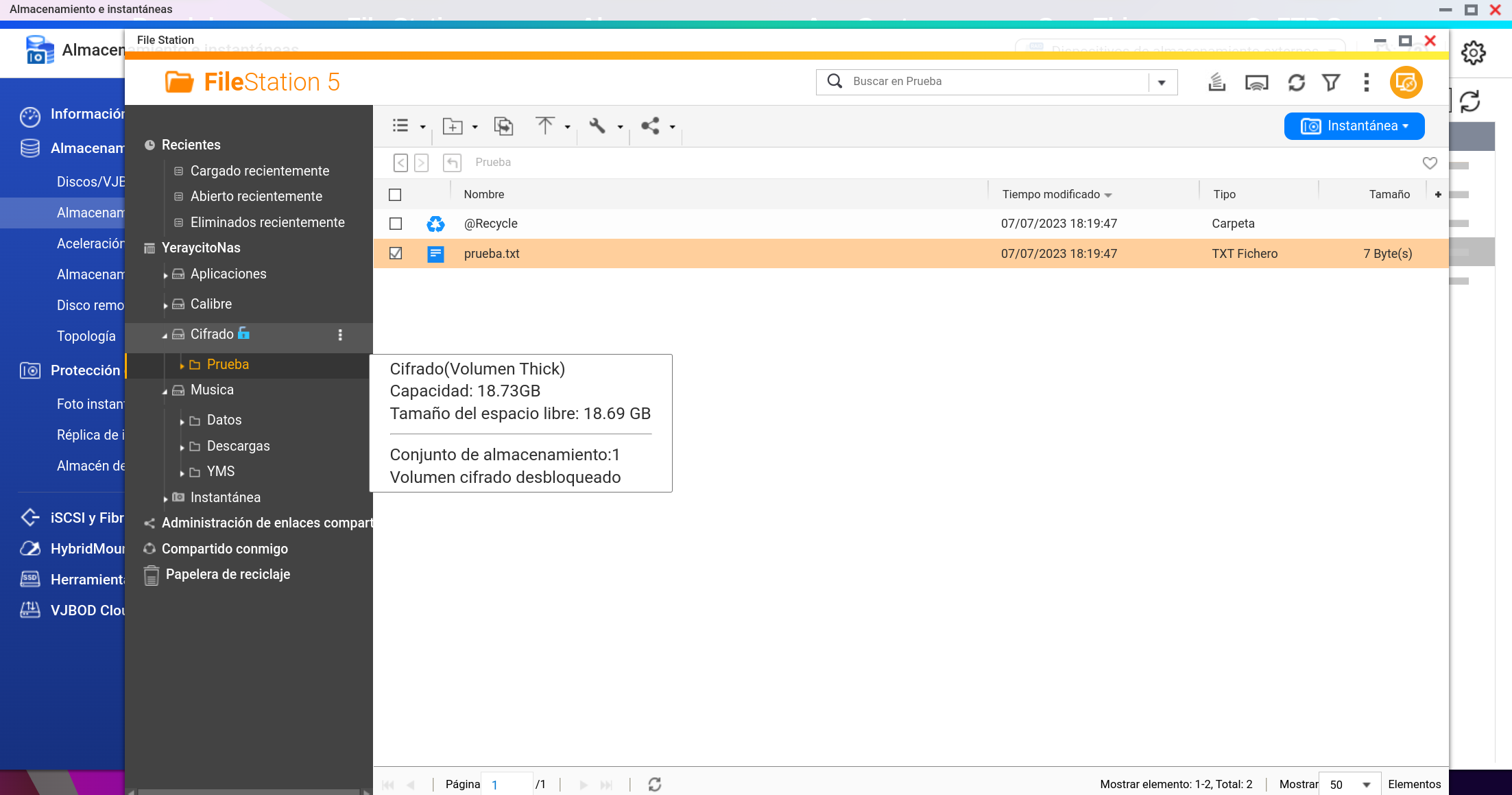 Por defecto al crear el nuevo Volumen cifrado este está desbloqueado y montado. Podemos acceder a su contenido tanto desde un ordenador mediante SMB o desde el nas mediante File Station.