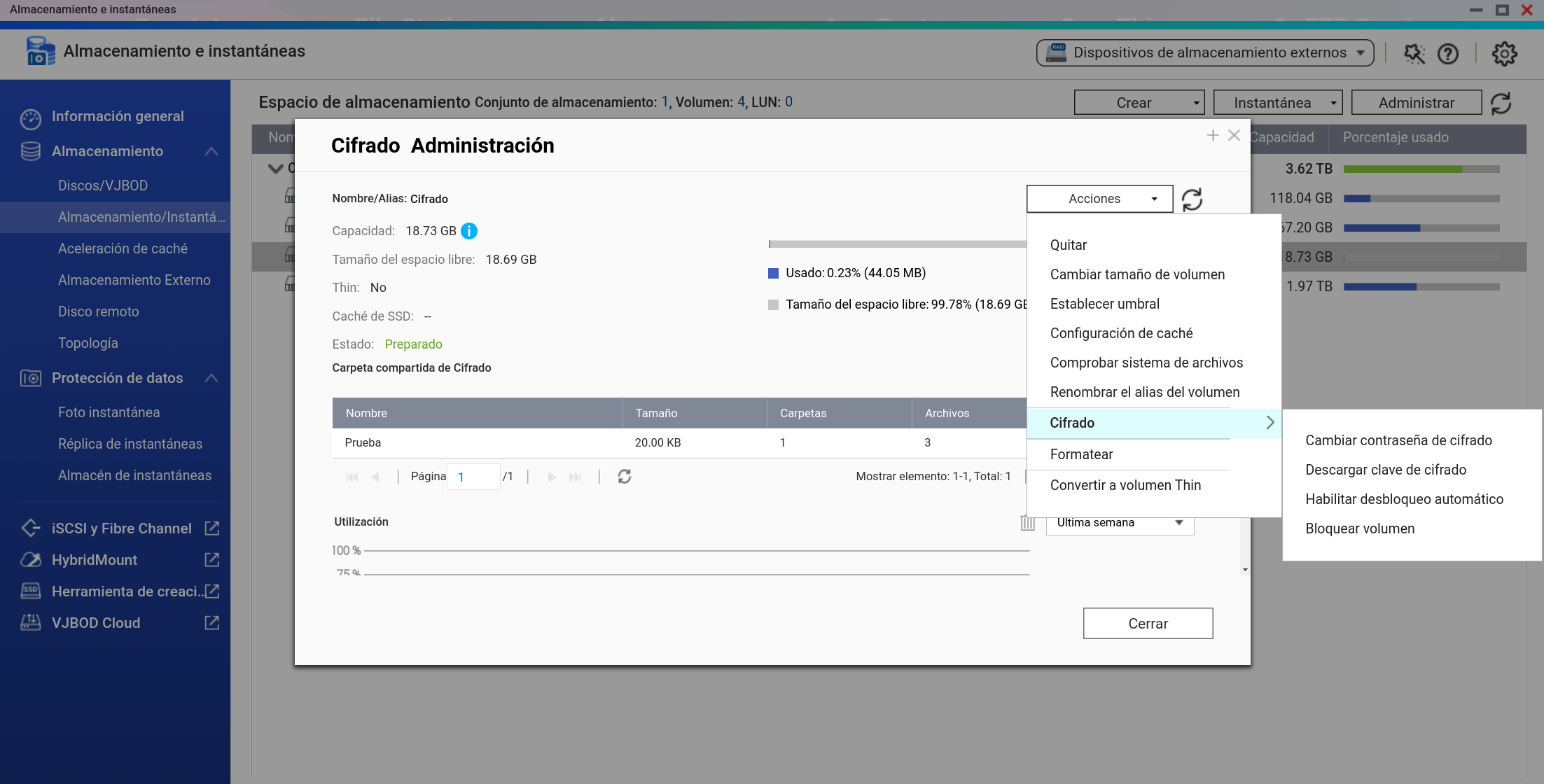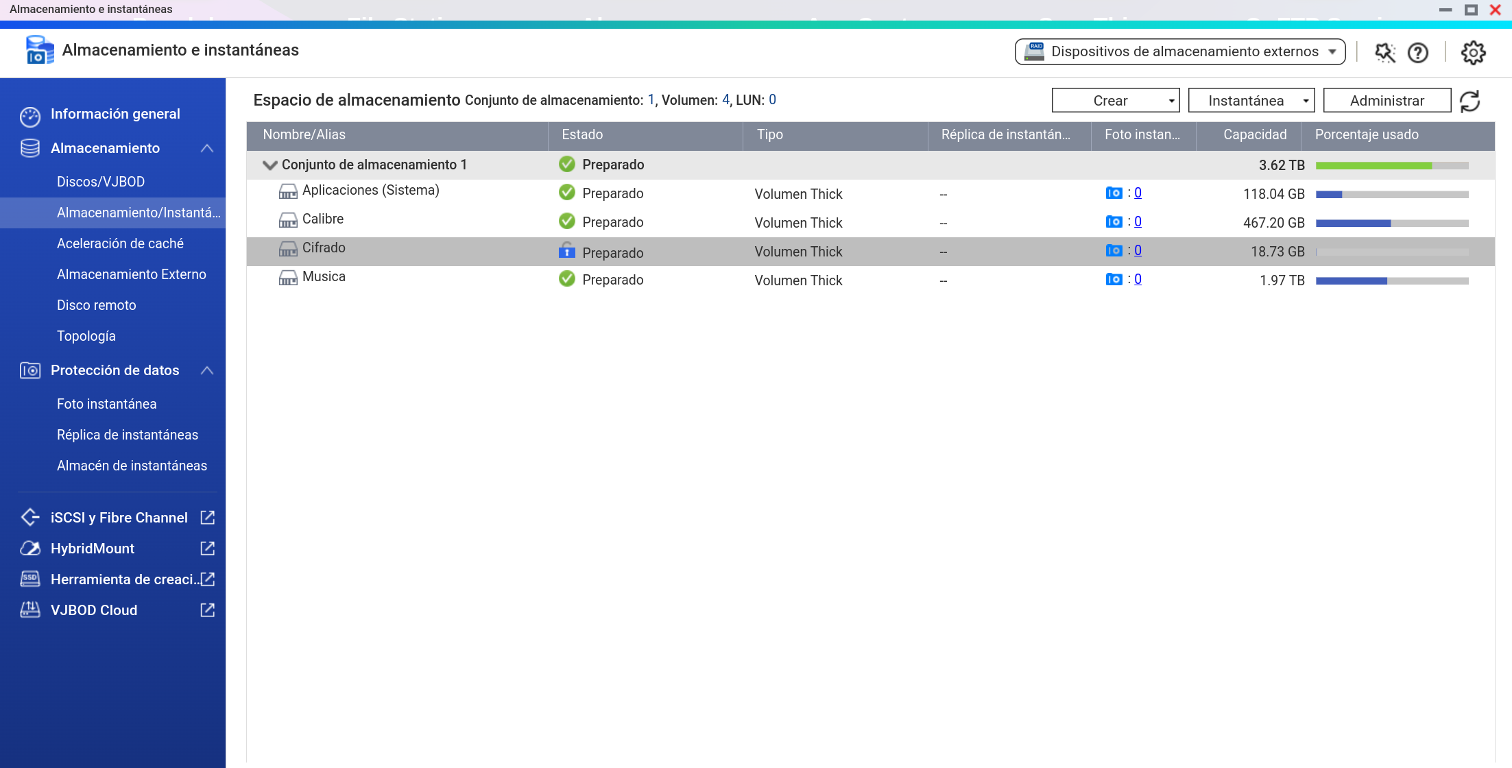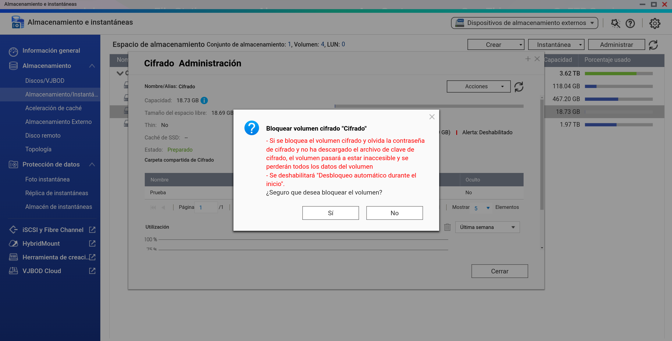 También lo podemos bloquear y desmontar desde Almacenamiento e Instantáneas dándole a Administrar el Volumen