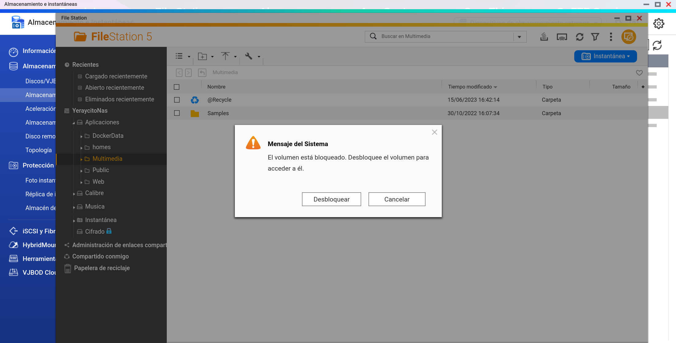 Si quisiéramos acceder al Volumen cifrado bloqueado desde File Station nos aparece lo siguiente