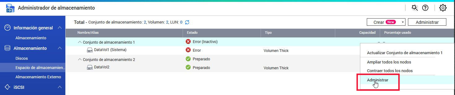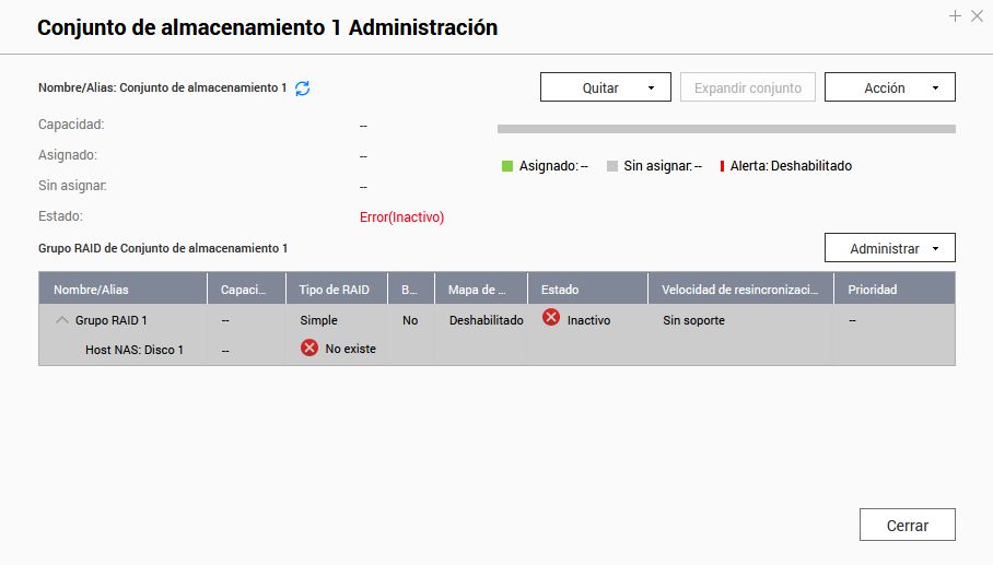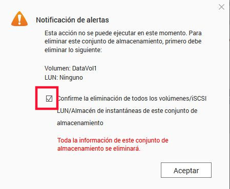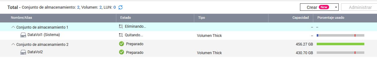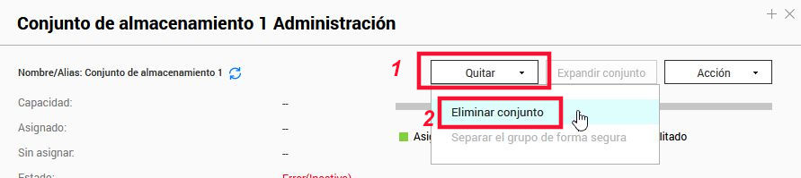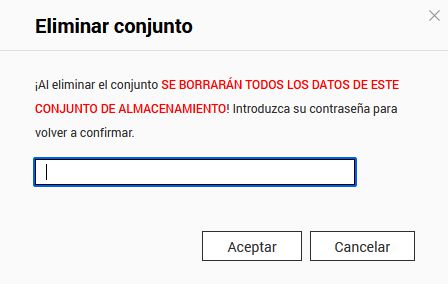 Una vez iniciada la nas, vamos a eliminar el conjunto de almacenamiento 1 que estará en error.