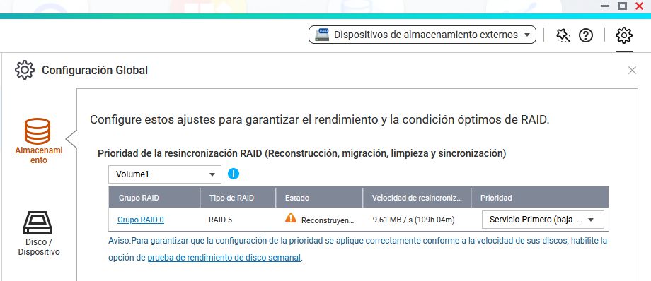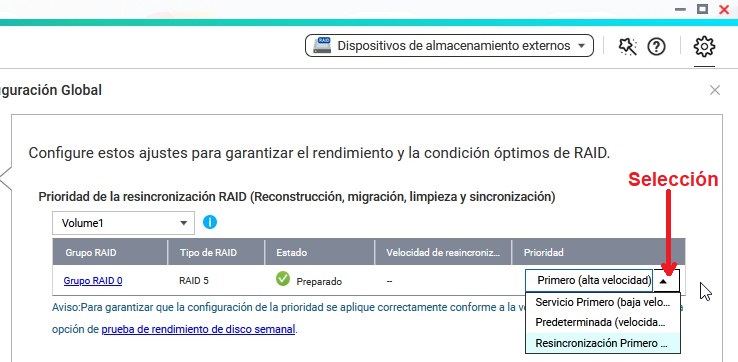 Aquí podemos elegir la velocidad de reconstrucción del raid vs prestaciones de la nas.