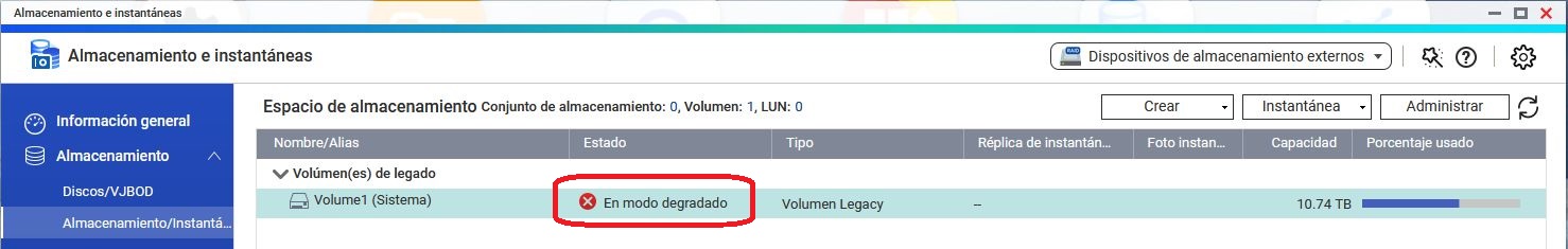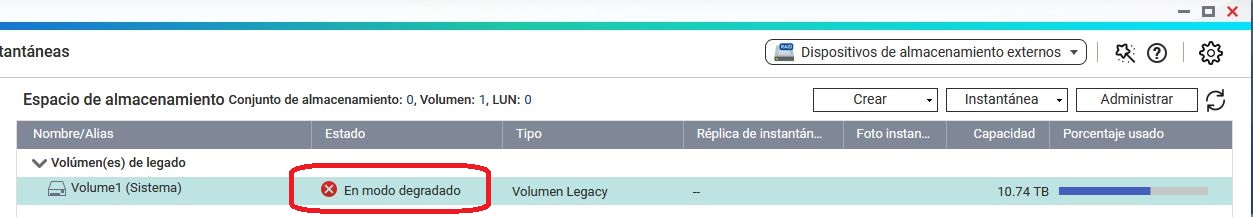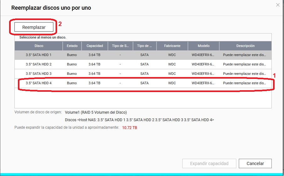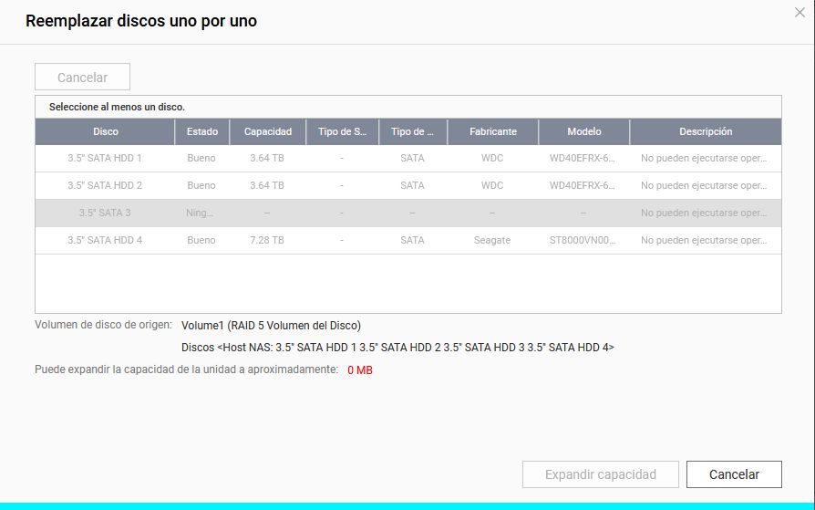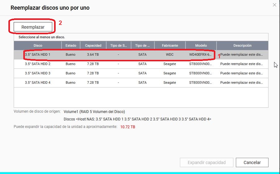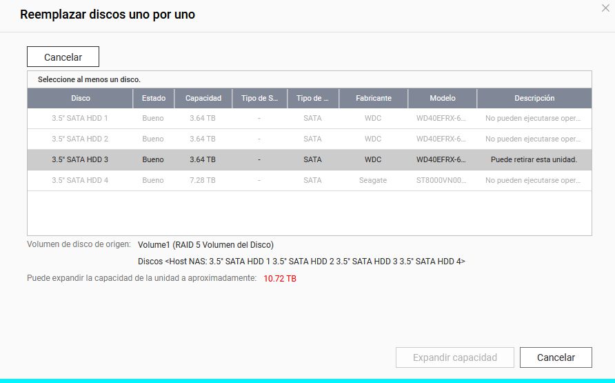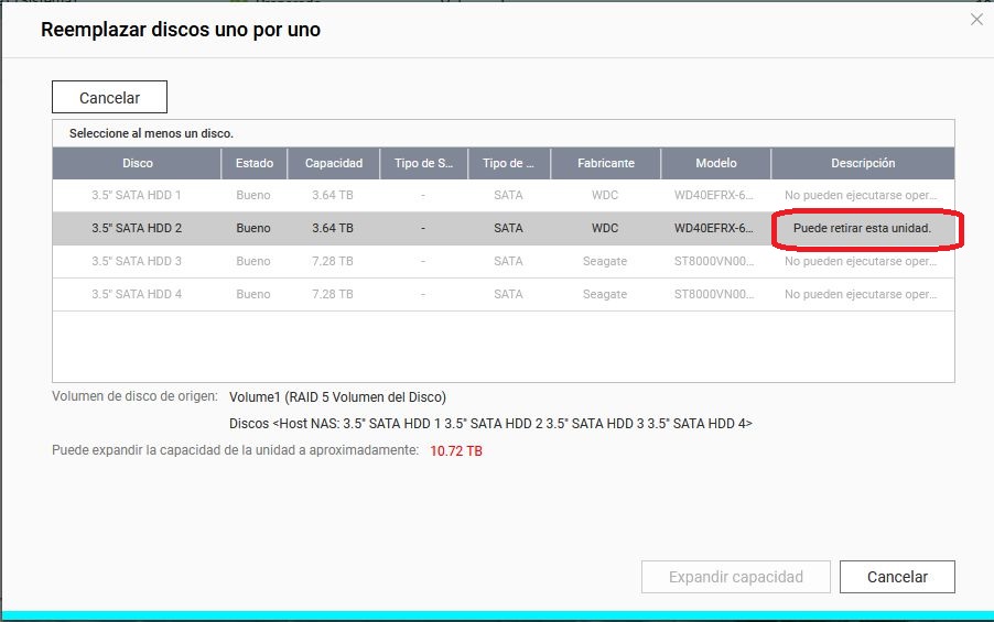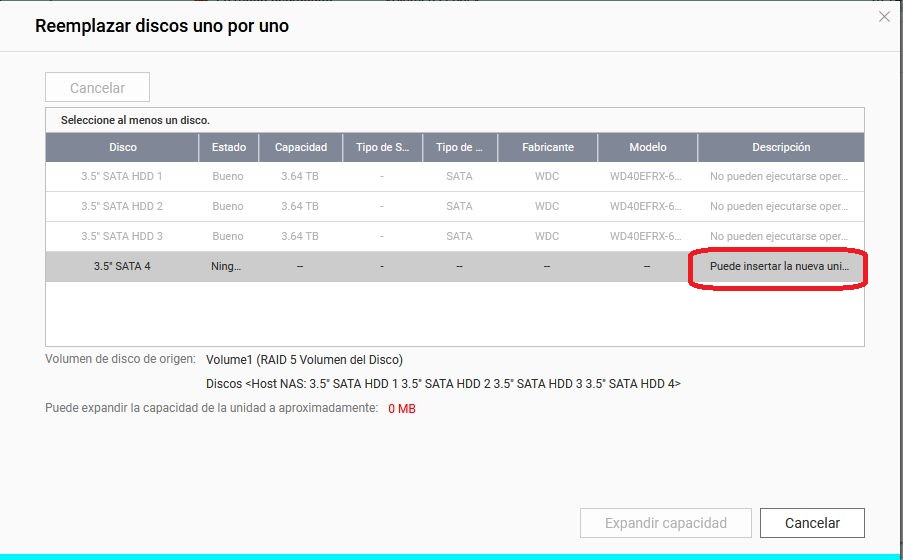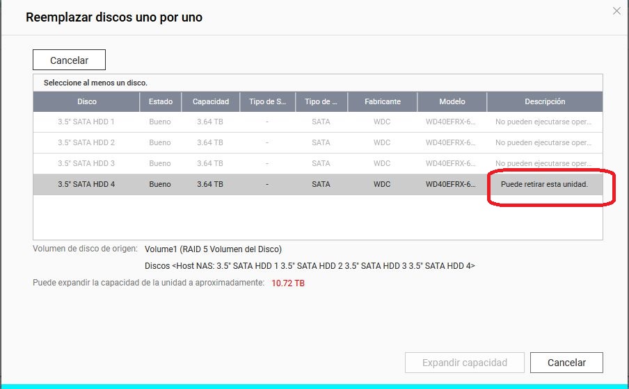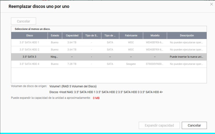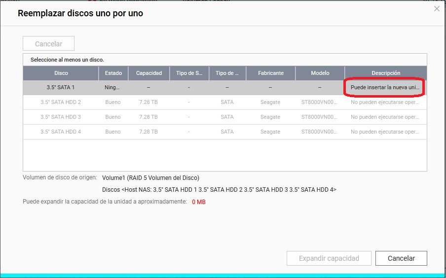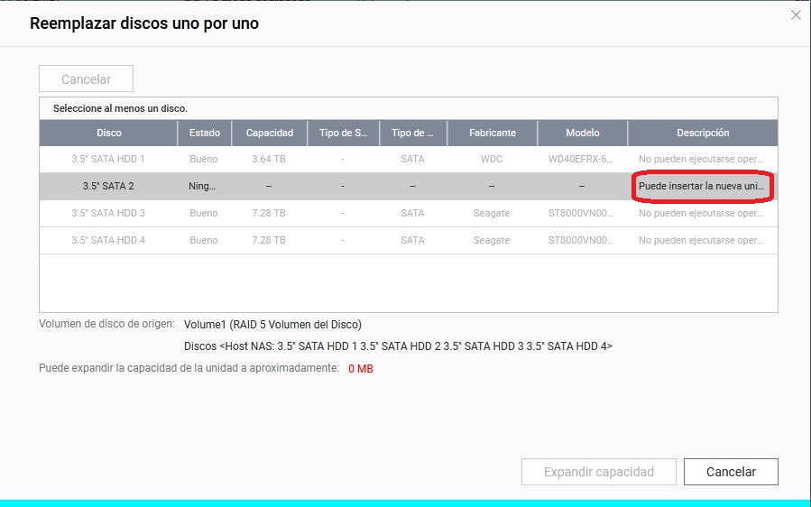 La NAS pitará y veremos en pantalla que ya no lo detecta y nos pide insertar el de reemplazo.