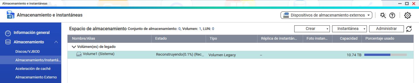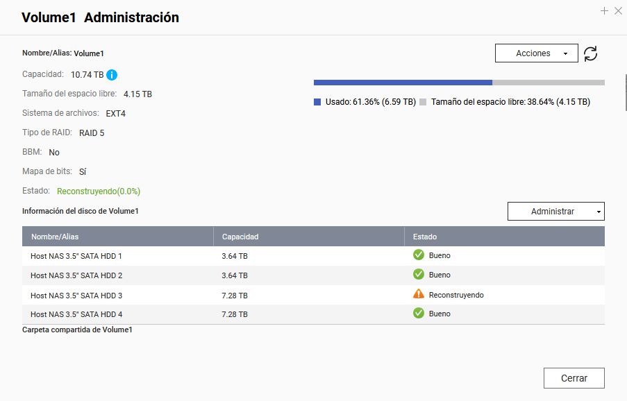 Eso sí, notaremos que hay actividad de discos en la reconstrucción de raid y que QTS se resiente a nivel de ejecución de otras funciones en función de la potencia de nuestra nas.