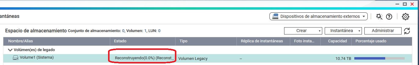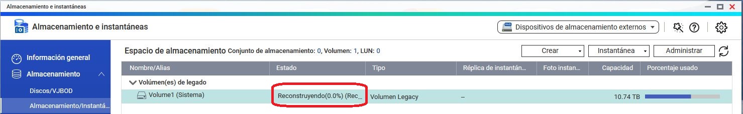 Un poco mas tarde, tras preparar de forma automática y transparente las particiones de QTS comenzará con la integración de ese disco en el raid y la reconstrucción del mismo.