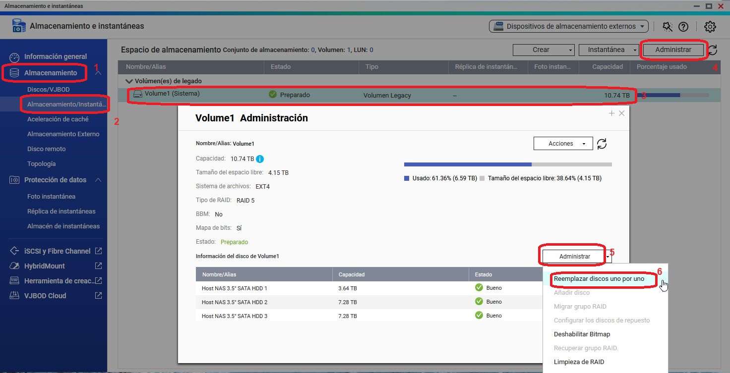 Pulsamos sobe "almacenamiento", "Almacenamiento/instantáneas", seleccionamos el volumen adecuado, pulsamos sobre el botón de "Administrar". En la nueva ventana que se abre, pulsamos de nuevo "Administrar" y elegimos "Reemplazar discos uno por uno"