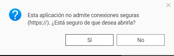 - Esta aplicación no admite conexiones seguras (HTTPS://) ¿Está seguro que desea abrirla?