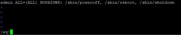 admin ALL=(ALL) NOPASSWD: /sbin/poweroff, /sbin/reboot, /sbin/shutdownuna vez la tecla ESC y escribimos :wq! , pulsamos la tecla Intro y el archivo será guardado