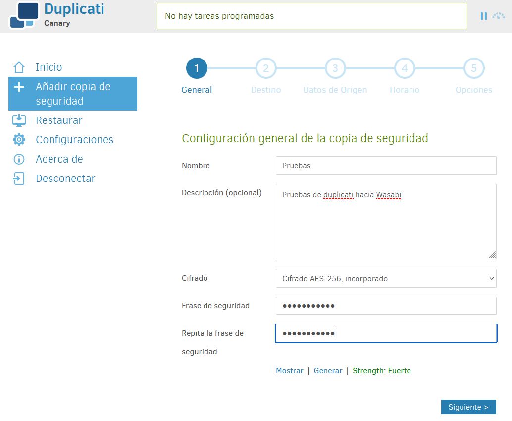 Aquí indicamos una descripción y la clave de cifrado que usará Duplicati.