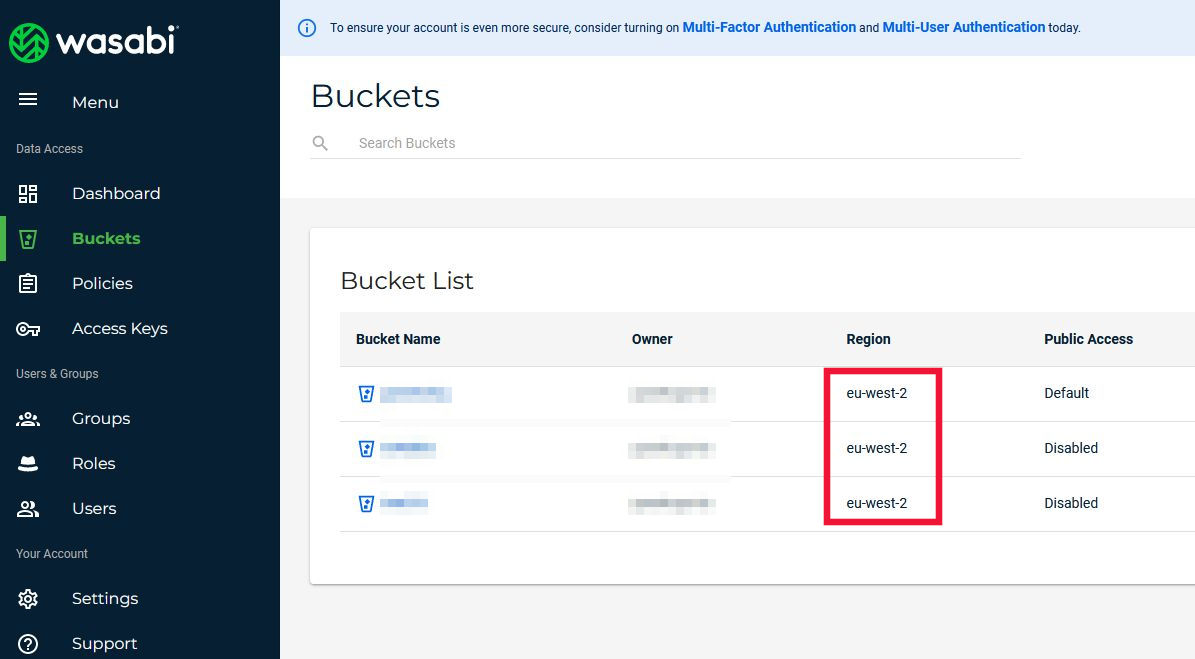 Para ello hemos de saber la zona donde está alojado nuestro Wasabi. Lo mejor es ir a la web de Wasabi, identificarnos y ver donde tenemos nuestro Buckets.