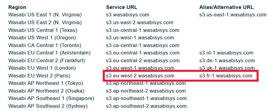 Para saber su url, acudimos a la web de Wasabi https://knowledgebase.wasabi.com/hc/en-u...ge-regions