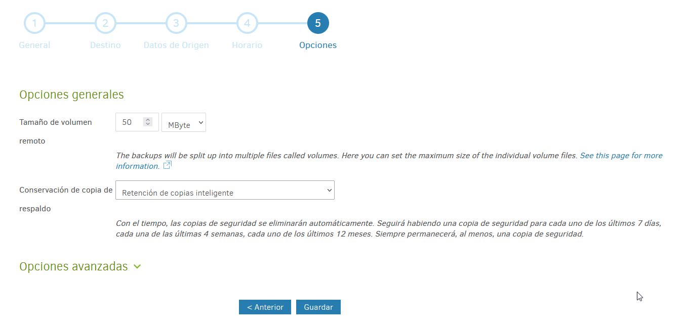 Y luego elijo el tipo de retención de copias y tamaño de los archivos en el almacén remoto.