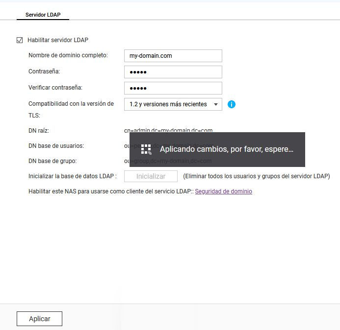 Si queremos que nuestra nas use los usuarios de un LDAP de otra NAS tendremos que dejar la pantalla con algo similar a esto usando los datos que definimos anteriormente: