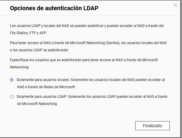 Con independencia de los casos anteriores, tras activarlo se nos preguntará quienes van a acceder por SMB a la nas (los usuarios locales o los del LDAP).