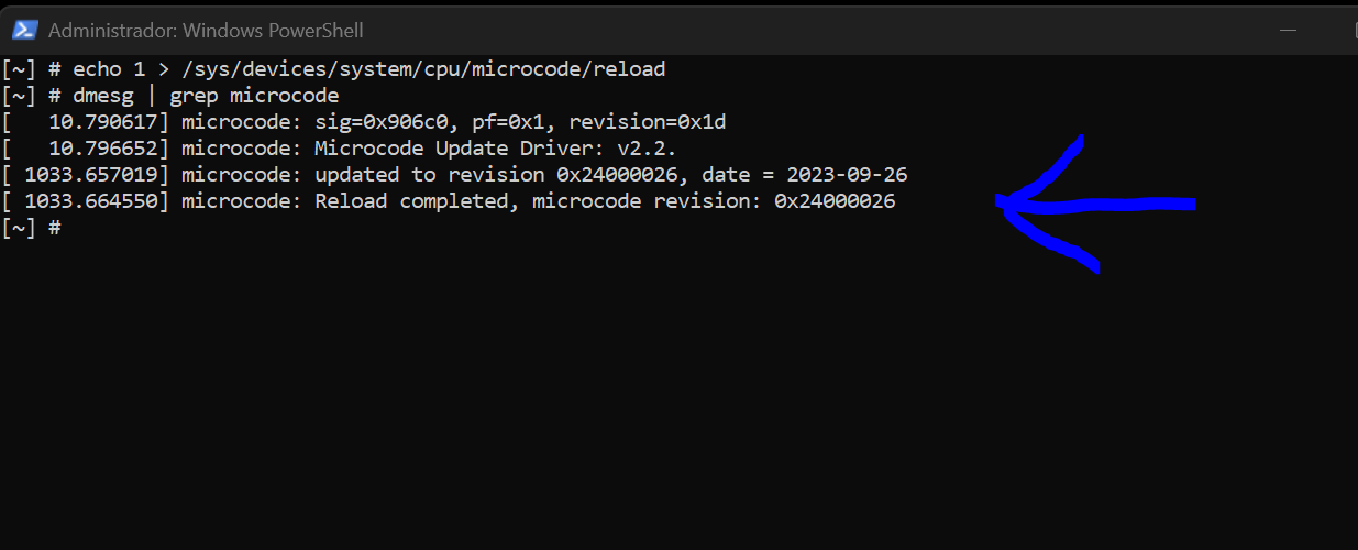 En la imagen que acabo de poner se puede ver además del citado comando que puse antes otro comando que sirve para comprobar que se ha hecho corréctamente la actualización del microcode. Se puede ver que el microcode del procesador Intel de mi nas se ha actualizado a la versión con fecha 26 - 09 - 2023 con el número de revisión 0x24000026