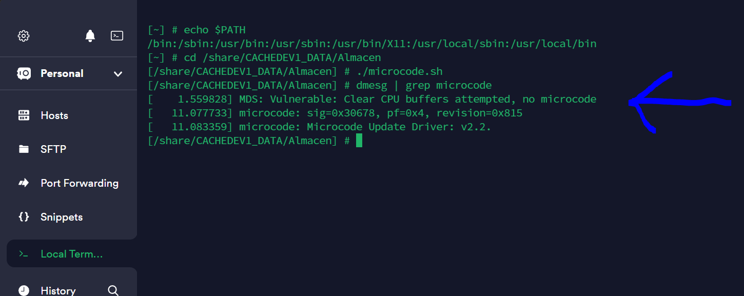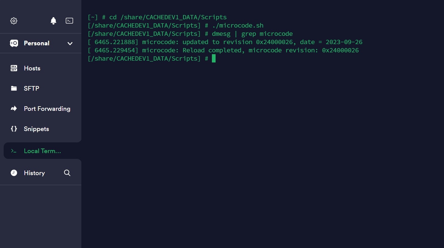 echo 1 > /sys/devices/system/cpu/microcode/reload &> /share/CACHEDEV1_DATA/Scripts/microcode.log