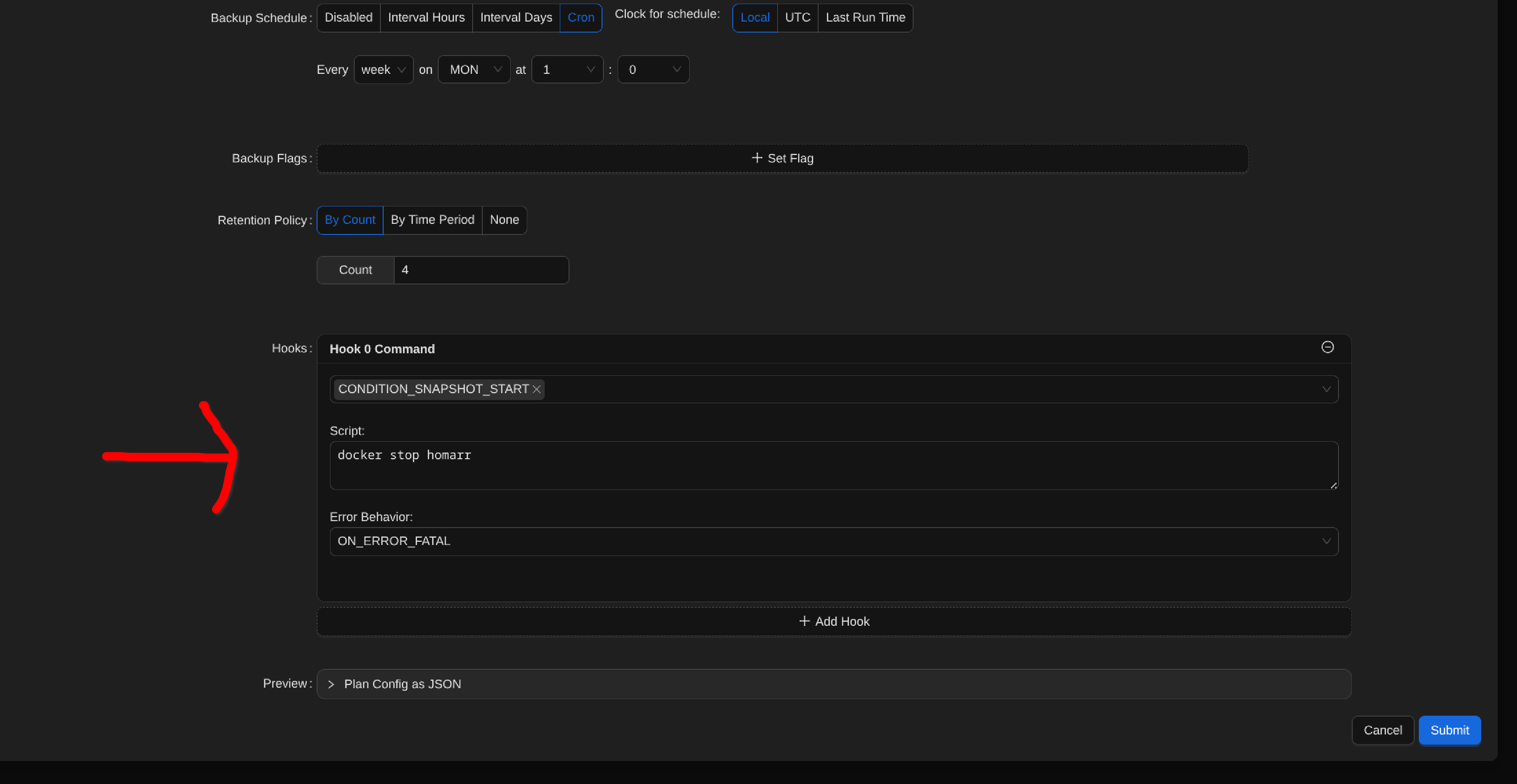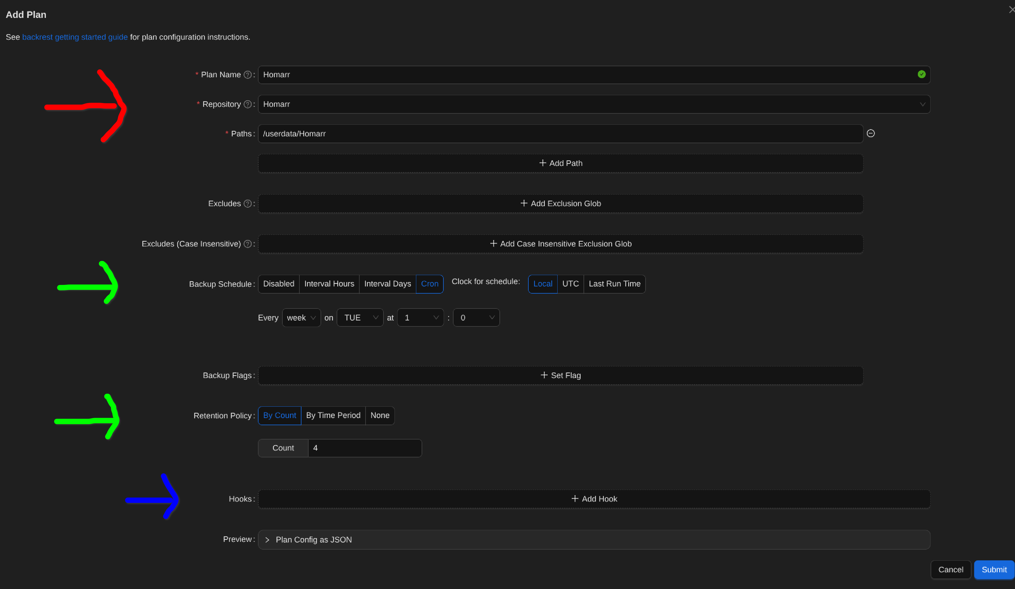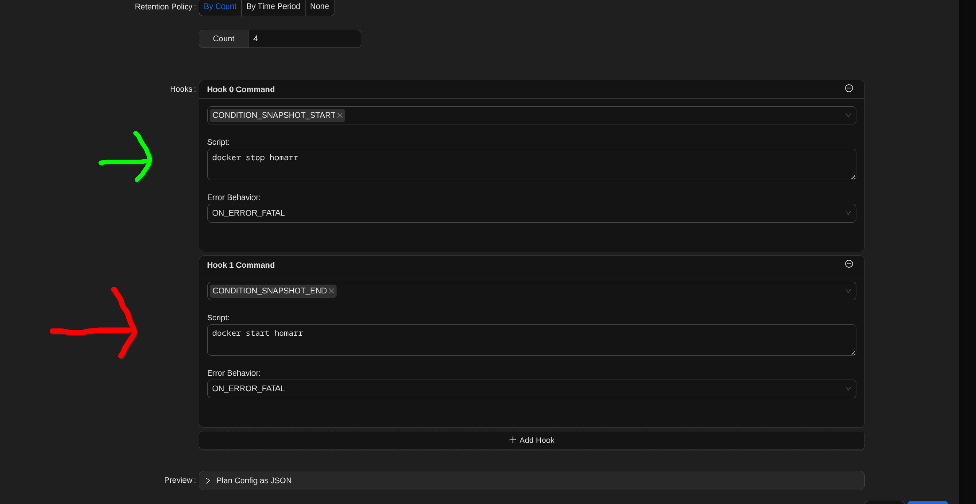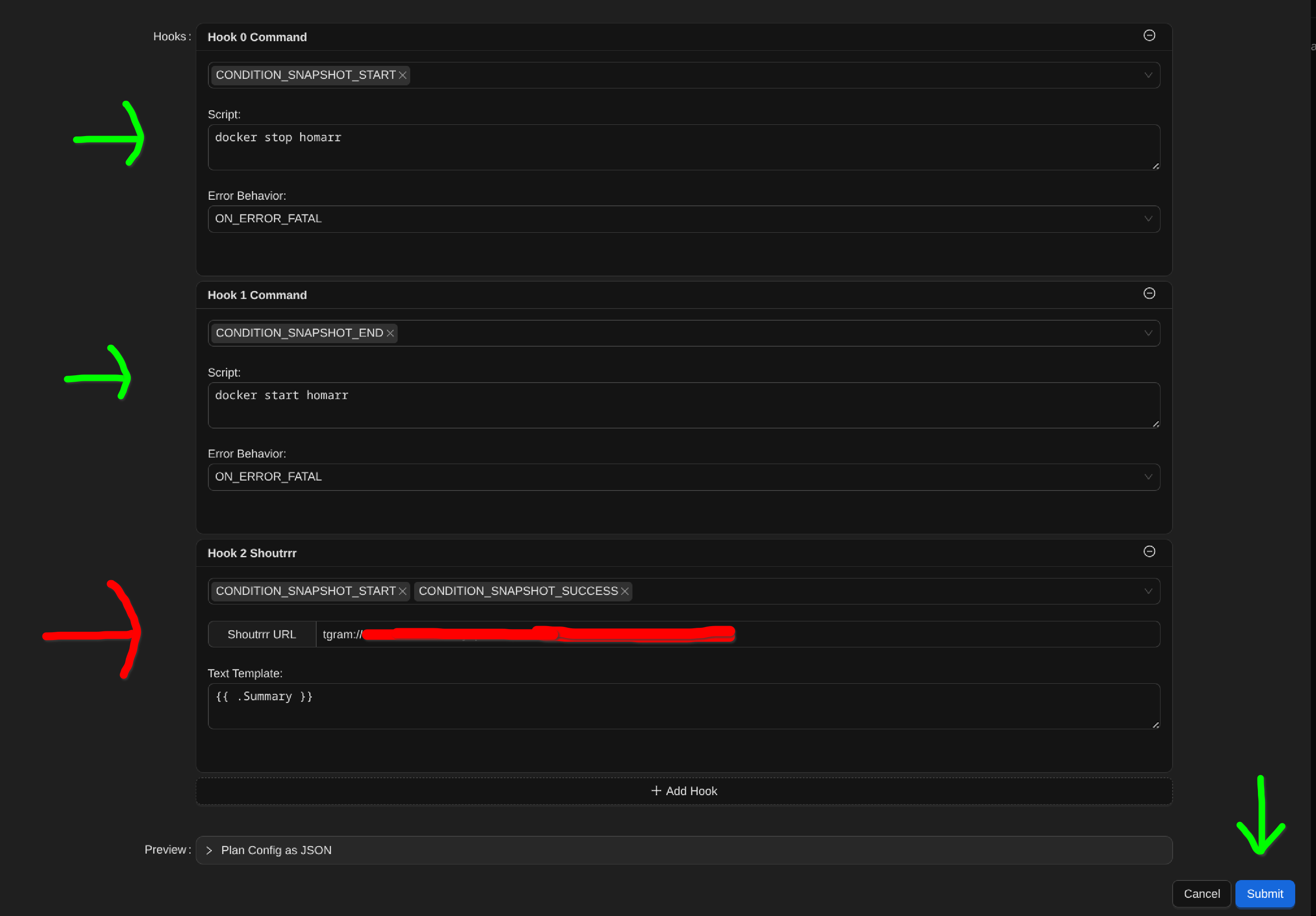 Con esto configurado ya tendríamos lista la copia de seguridad automatizada del contenedor, en este caso, Homarr, si opcionálmente quisiéramos que Backrest nos notificara el inicio - finalización de la copia de seguridad, por ejemplo, a través de un bot de Telegram añadimos un tercer Hook junto a los anteriores.