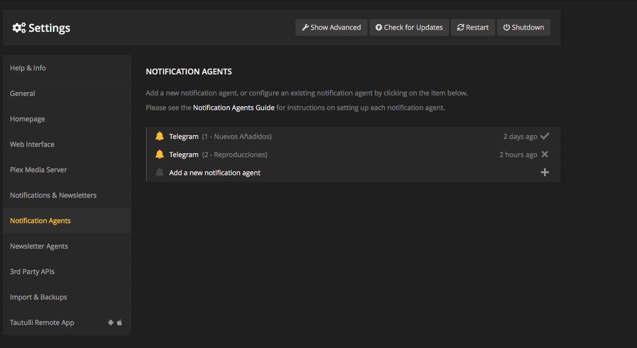 - Nos logearemos en Tautulli e iremos a configuración/Notification Agents y le daremos a: add a new Notification agent y seleccionamos Telegram