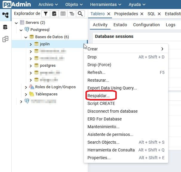 docker cp nombre_docker_pgadmin:/var/lib/pgadmin/storage/usuario_pgadmin/joplin /share/Public/joplinHe usado como destino la carpeta Public porque existe en todas las nas de QNAP y así no tenemos pérdida a la hora de recuperarla