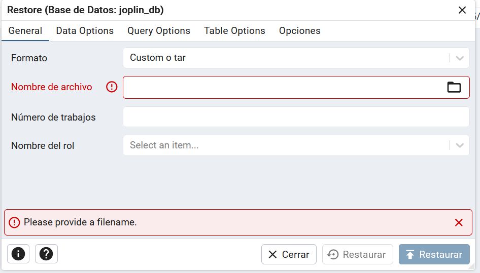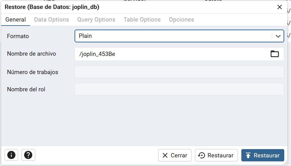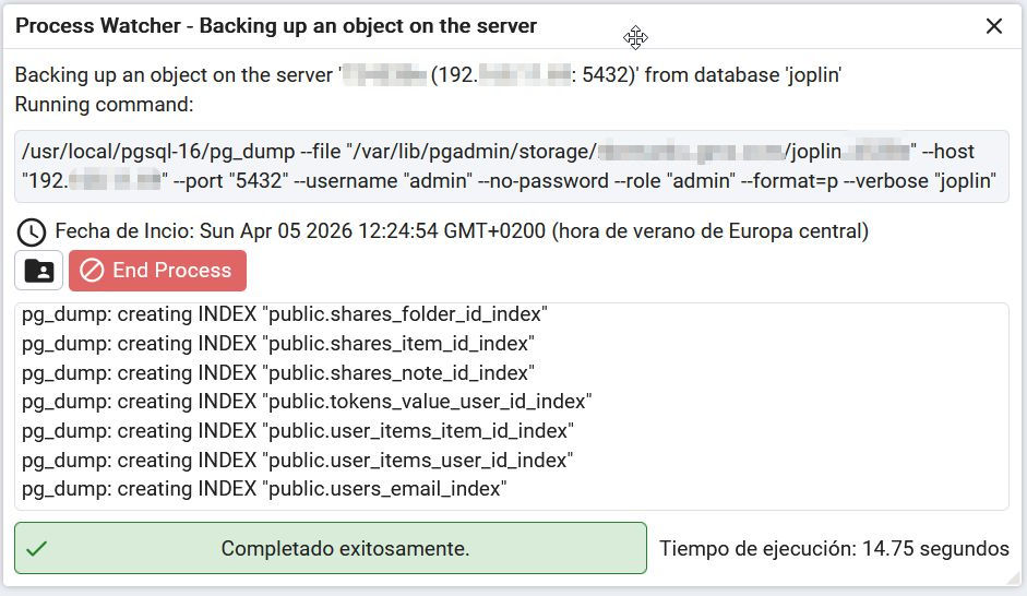 Es decir, que podíamos haber generado un nuevo postgresql y joplin vacíos, luego exportaríamos los datos Joplin con un cliente y desde un cliente reconfiguramos la conexión al nuevo Joplin y restauraríamos los datos