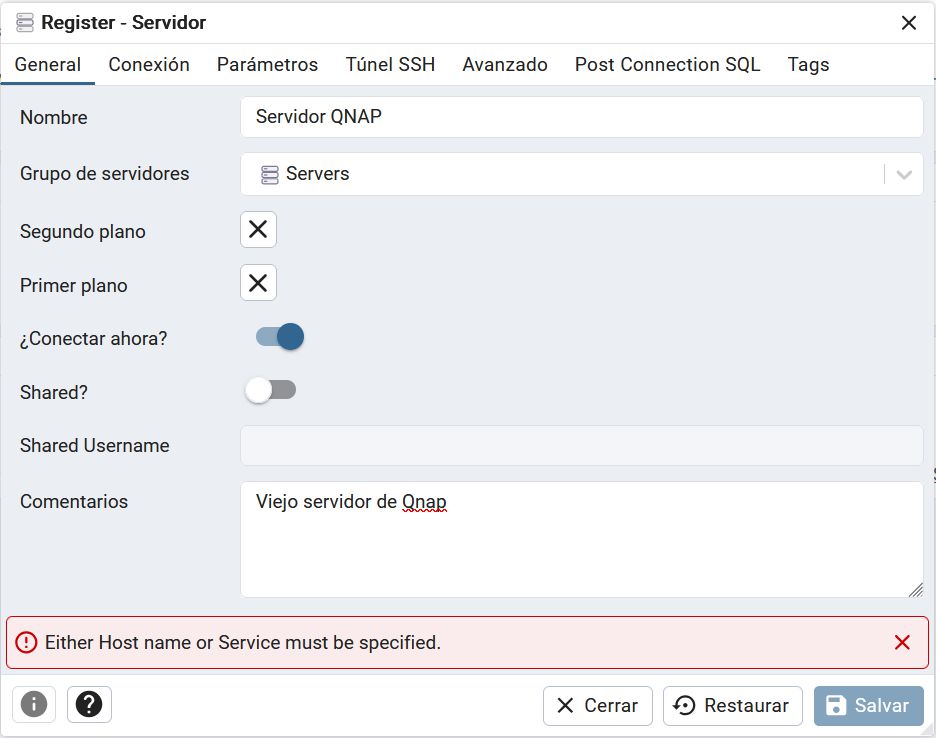 De la misma forma, si no quisiéramos instalar el docker de PgAdmin en la nueva máquina, podemos usar el PgAdmin de la vieja para agregar el servidor postgresql de la máquina nueva y de esa forma el PgAdmin de la vieja puede gestionar las BBDD de postgreSQL de la nas vieja y las de la nueva máquina.