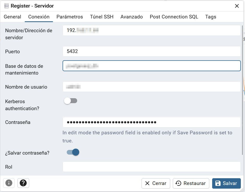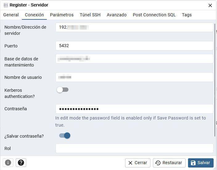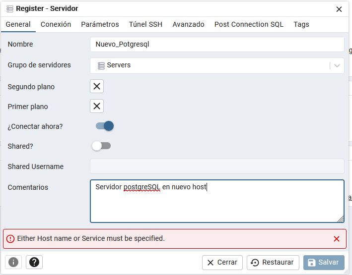Suministramos los datos del nuevo servidor de PostgreSQL para registrarlo