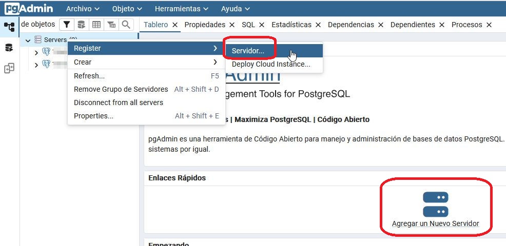 Aquí tras identificarnos en el PgAdmin, hemos de agregar un nuevo servidor de postgresql en su lista.