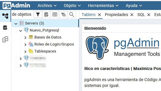 Y con eso, ya tendremos nuestro servidor PostgreSQL de la máquina nueva, registrado en el PgAdmin de la Nas vieja