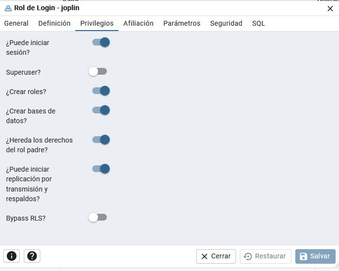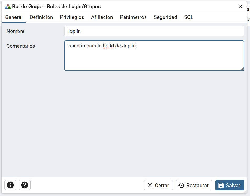 y ya tendremos creada la base de datos "joplin_db" vacía con un usuario llamado "joplin"