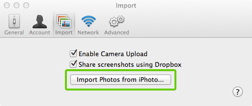 If you have iPhoto 7.0 or later, you can import photos from your iPhoto library to Dropbox using the latest version of the Dropbox desktop application.