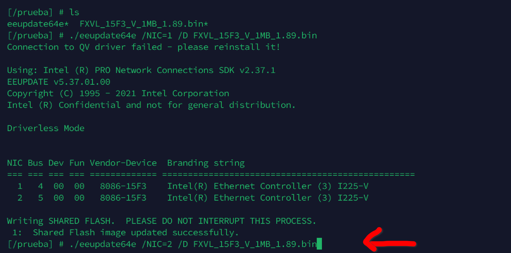 Como todo ha ido bien procedo a flashear mi segundo interfaz de red NIC2 con el siguiente comando: