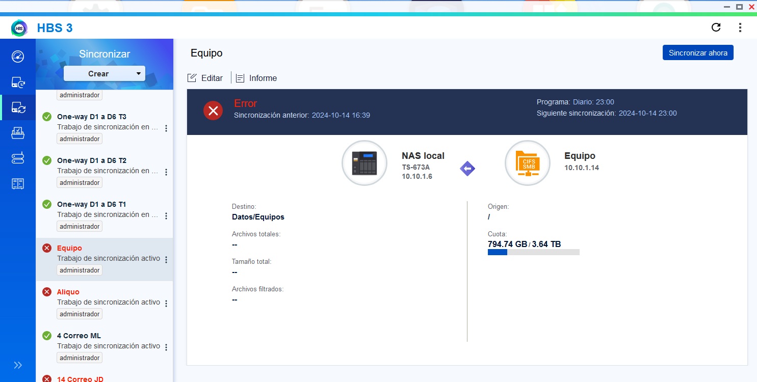 Si miro la conexion del almacenamiento que tengo en windows server me indica que es correcta, pero cuando ejecuto la sincronizacion no me hace nada y me aparece error.