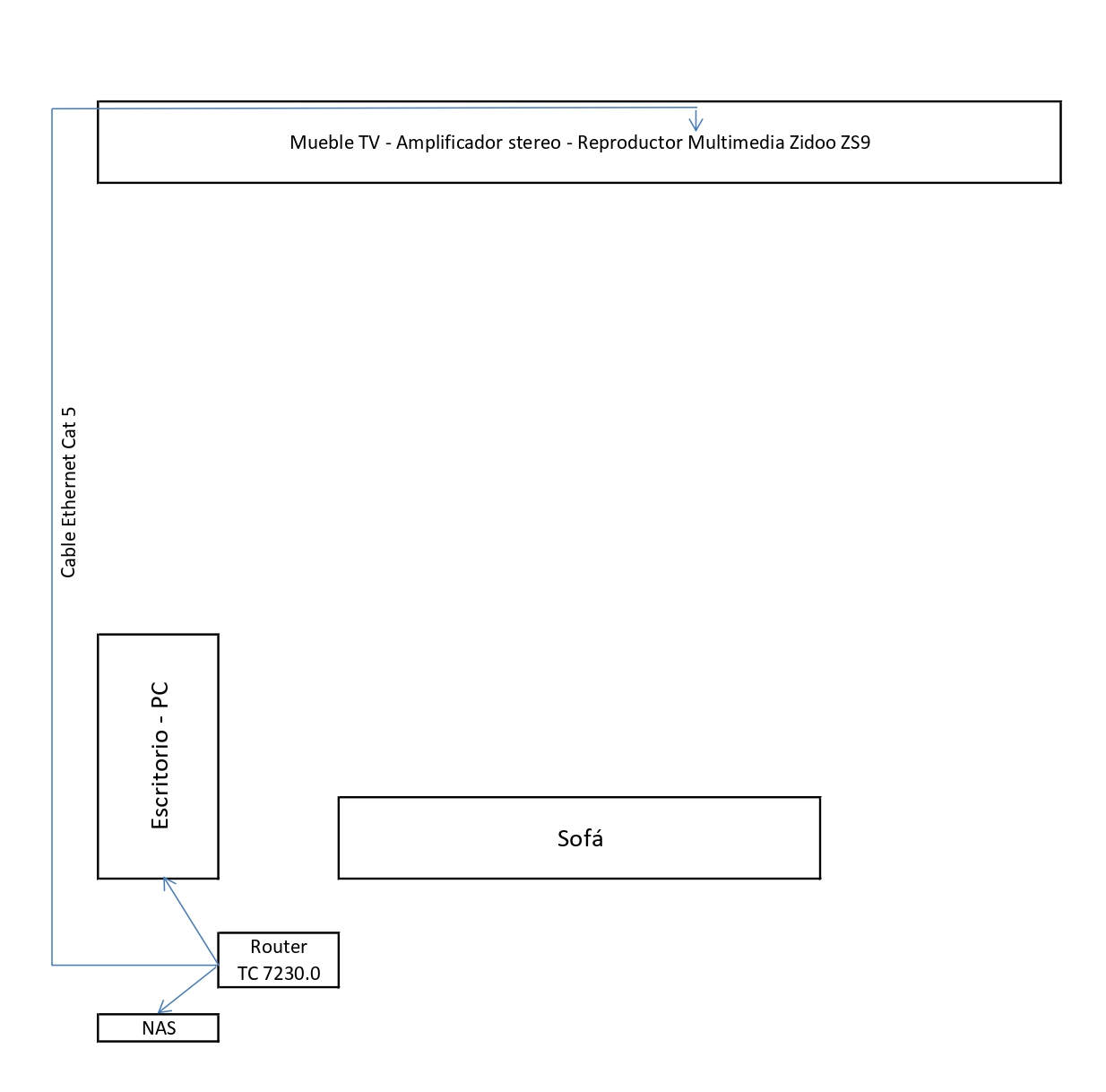 1 - ¿Cerca del PC y del router? Con dos cables de 1 metro Cat 6 enlazo el router con el PC y el NAS. El repro multimedia Zidoo se quedaría junto a la tele y el ampli.