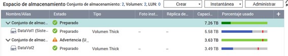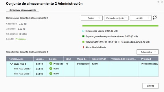 Tengo un qnap TS-453-A de 4 bahías, y hasta ahora tenía dos ocupadas con dos discos de 4 TB. El sistema estaba configurado con un conjunto de almacenamiento y un volumen como cnjunto RAID1. Hace una semana compre otros dos discos de 4TB. He seguido el proceso de instalación para un nuevo conjunto de almacenamiento y un nuevo volumen, con los dos discos nuevos, y al final me reconoce solo la mitad de la memoria del segundo.
